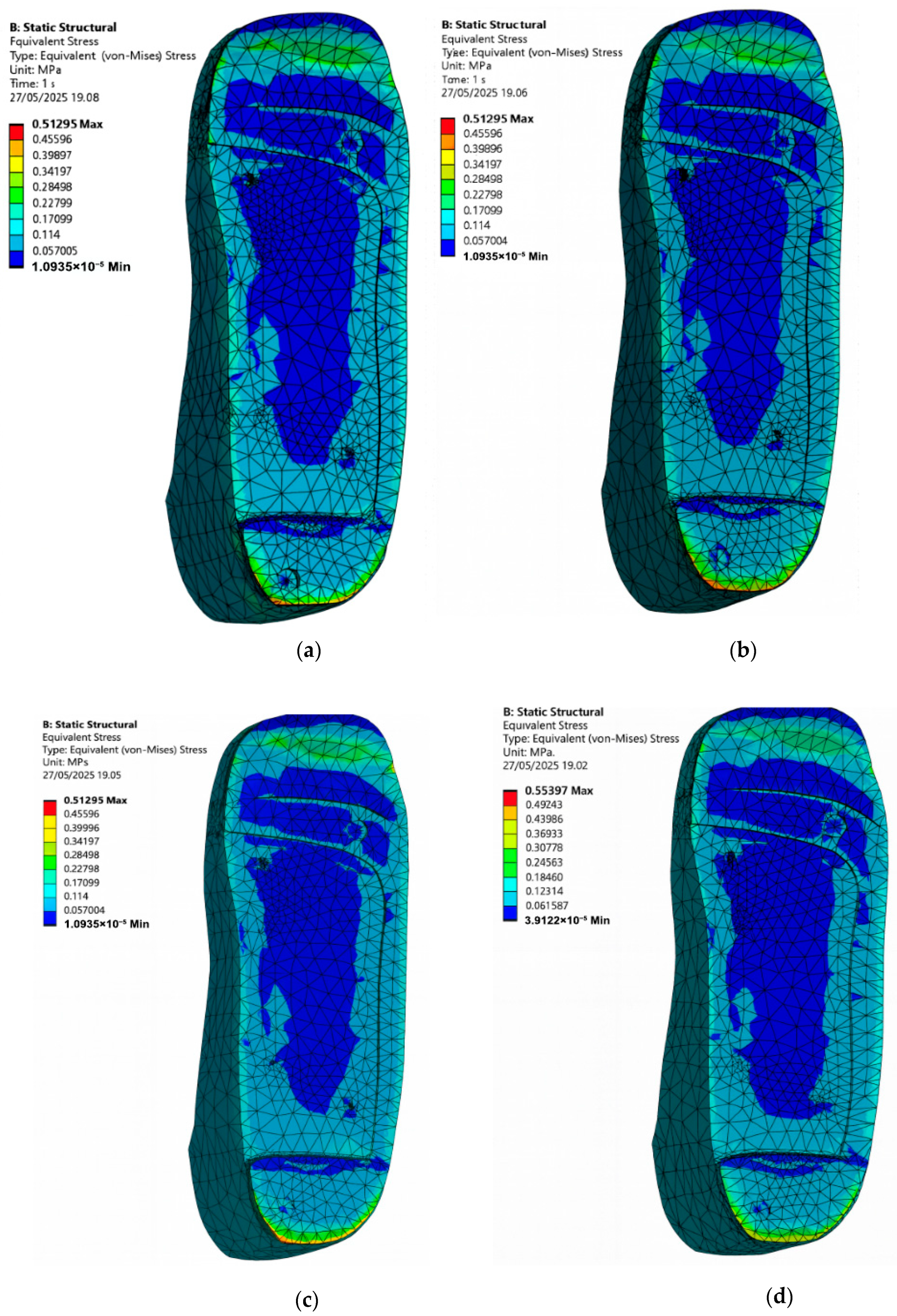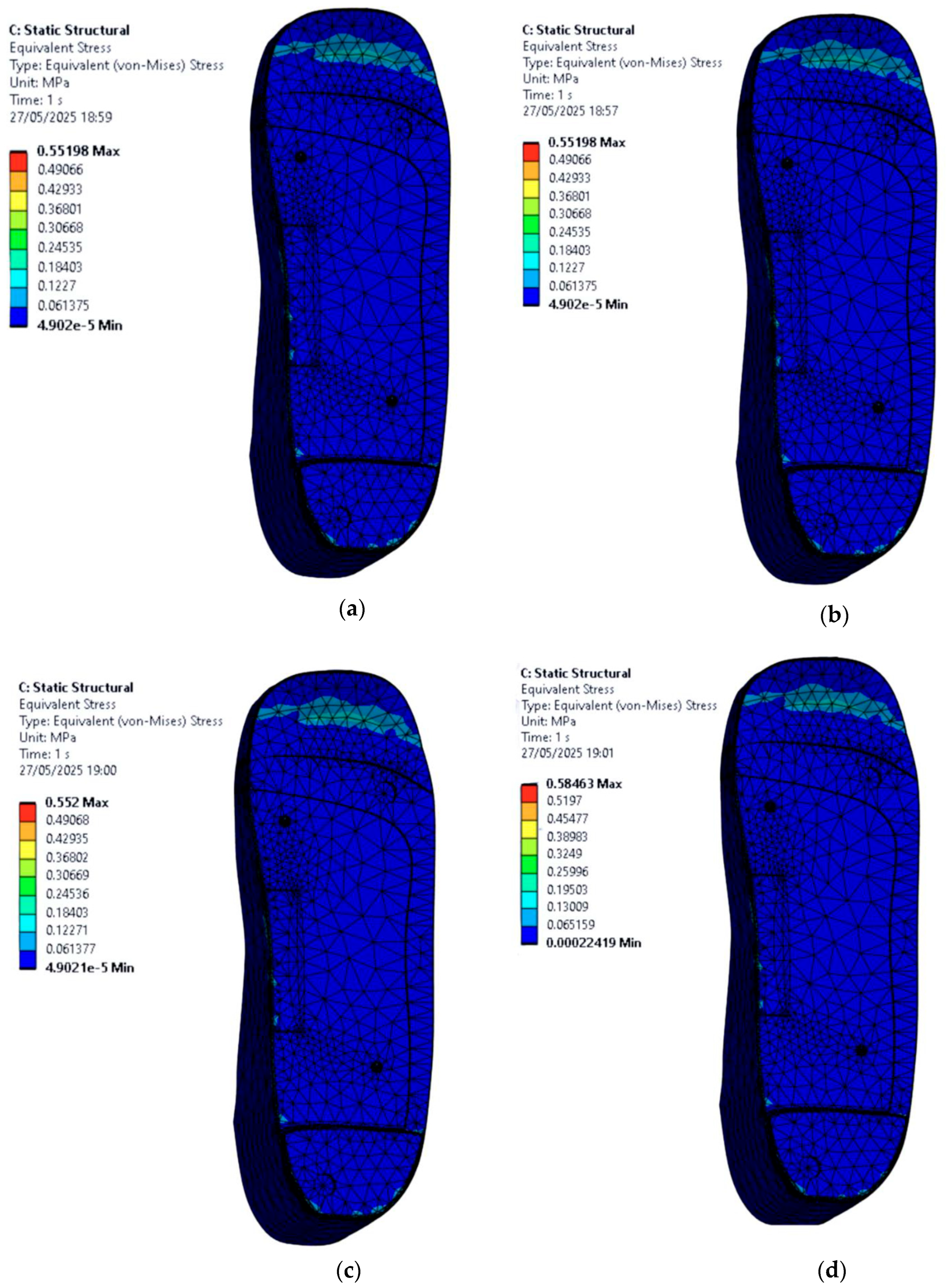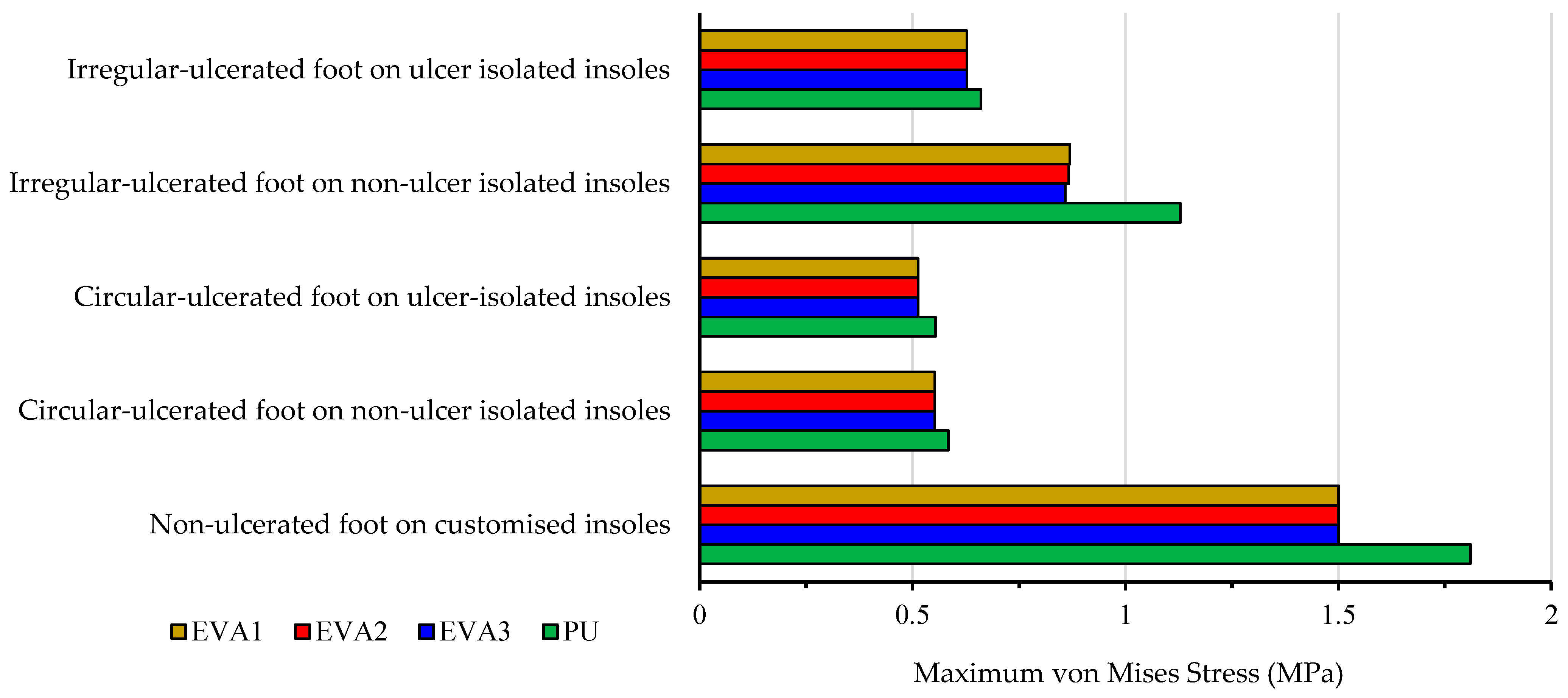 - Material Selection and Stress Reduction: Among all tested materials, EVA1 (Shore A65) consistently produced the lowest stress values. For example, in the non-ulcer foot condition, EVA1 (1.50 MPa) reduced stress by 17.12% compared to PU (1.81 MPa), which showed the highest values. This demonstrates that softer and more elastic materials are better at absorbing shock and redistributing pressure in diabetic feet.
