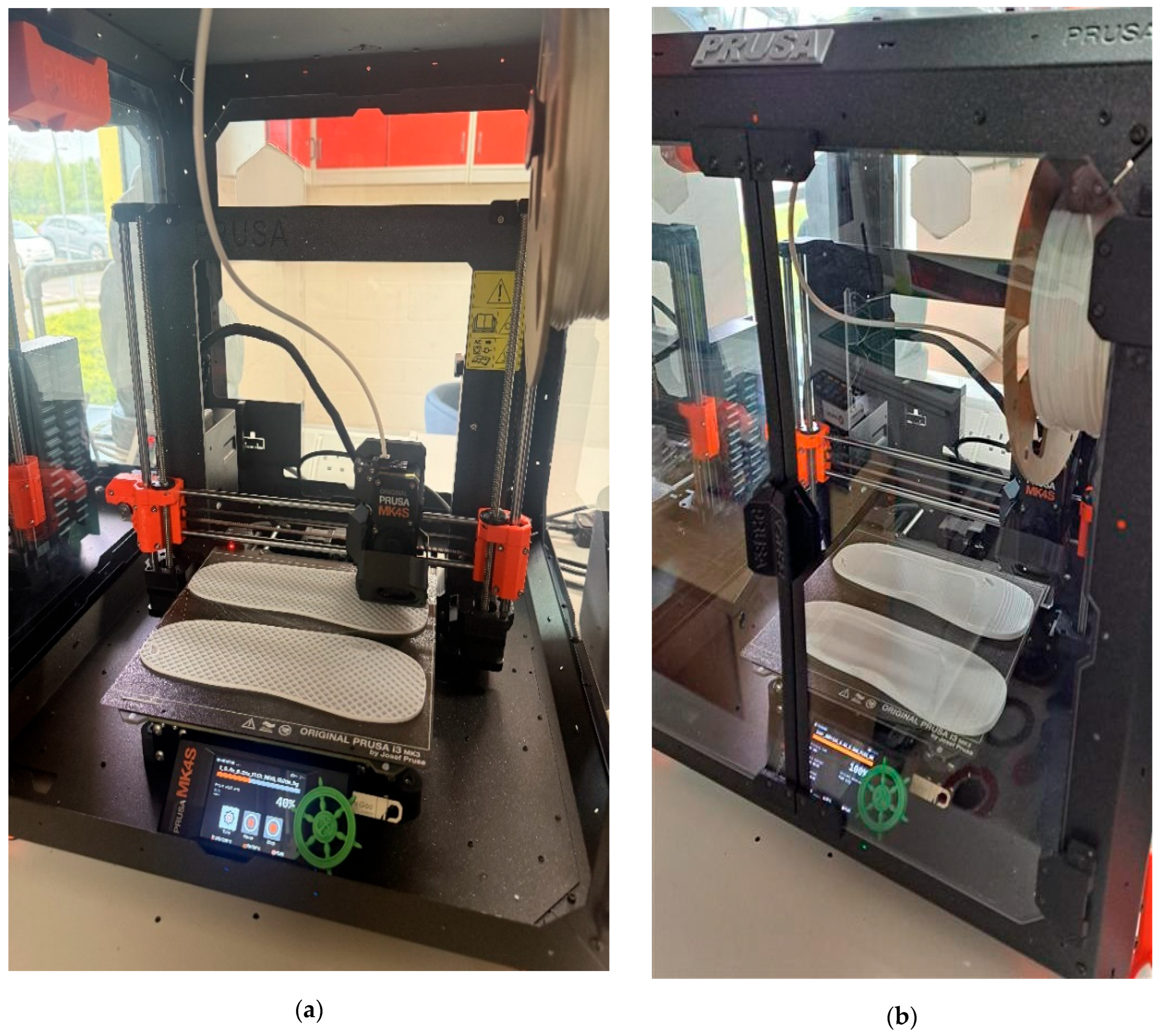 - Three-Dimensional Printing for Effective and Accessible Prototyping: All three insole models, including the standard design, the circular-cutout design, and the irregular-cutout design, were successfully printed using flexible EVA and PU filaments with the FDM additive manufacturing technique. Each specimen required approximately 8 h of print time, and the process was carried out entirely at the additive manufacturing laboratory of Anglia Ruskin University. This demonstrates that simulation-led workflows can be practically and affordably translated into physical prototypes using standard additive manufacturing technologies.