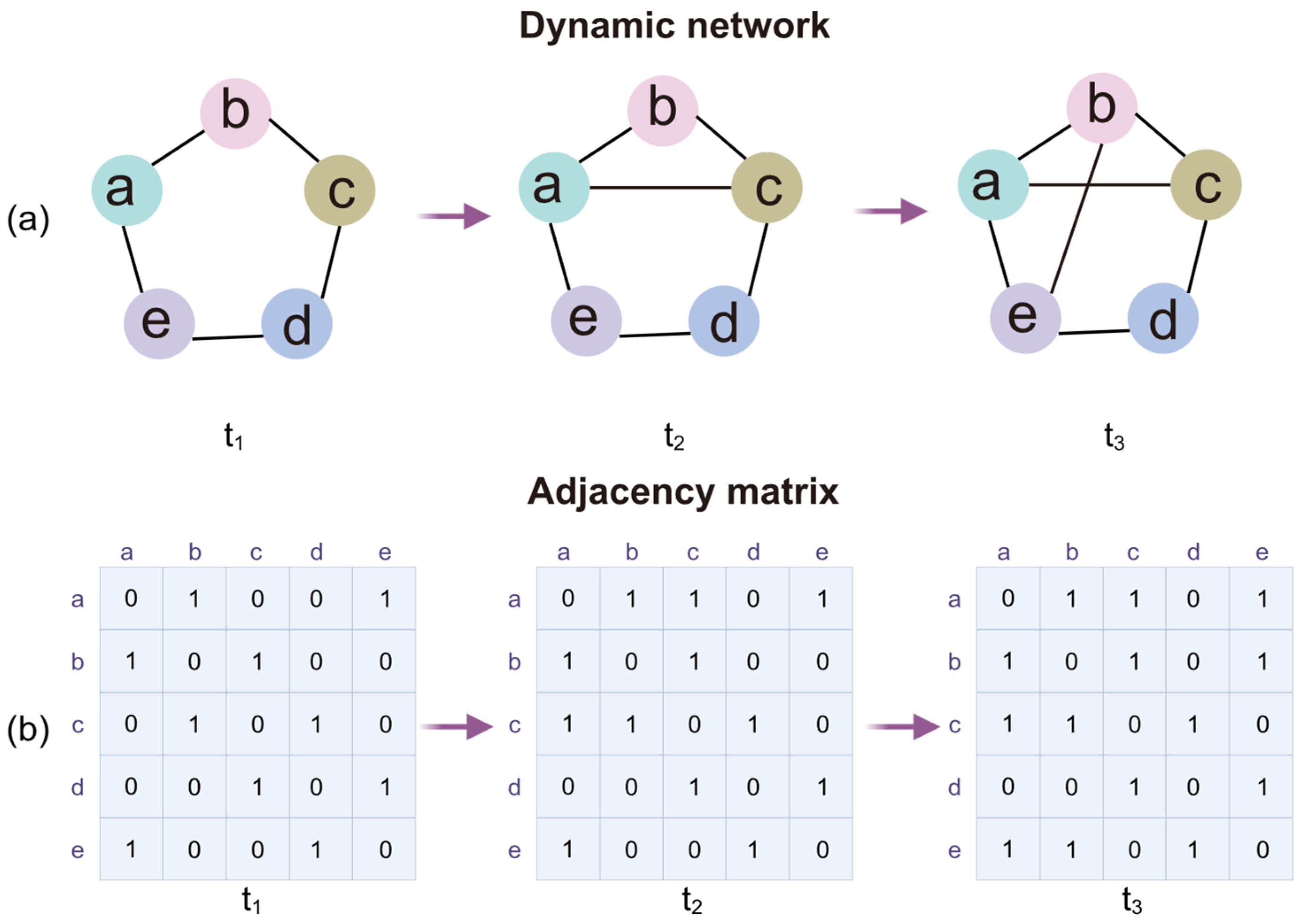 Suppose a dynamic network initially consists of a set N of nodes and a set E of edges. The nodes and edges of a dynamic network usually evolve over time, denoted by a time factor t, so that G(N(t), E(t)) defines a dynamic network G at time point t (
