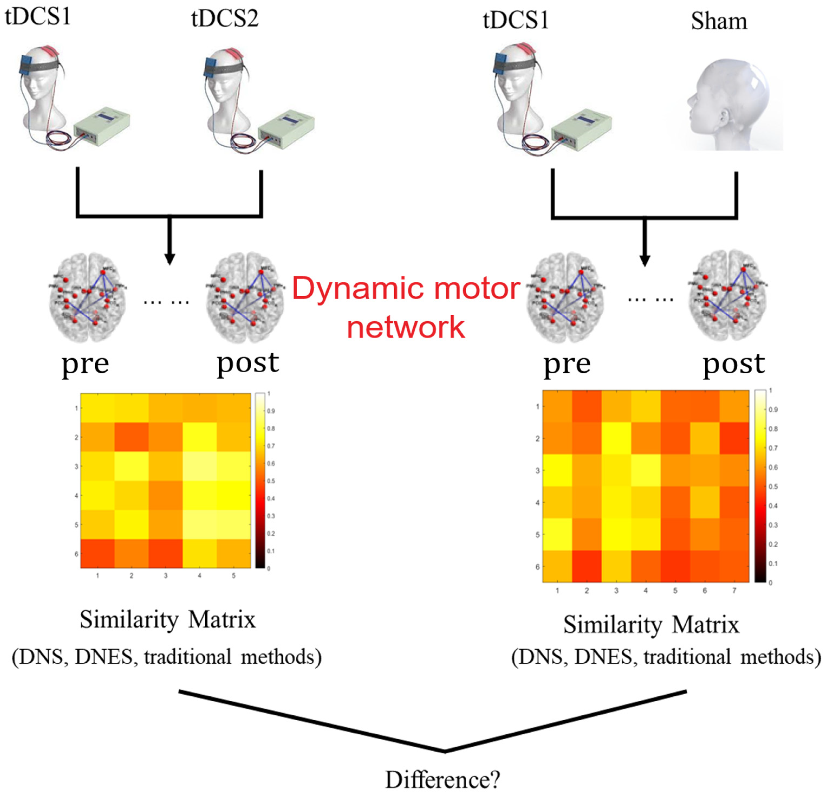 DNS and DNES scores were first computed within subjects to characterize the similarity of dynamic motor networks between the pre-treatment and post-treatment sessions for each individual. This within-subject computation captures the extent of rehabilitation-related reorganization in a given patient’s motor network. To validate the effectiveness of the proposed indices in reflecting treatment-specific rehabilitation patterns, we further conducted between-subject comparisons. A reasonable hypothesis was that the rehabilitation of the motor networks of the patients treated with the same therapy (ST) should be more similar than that would be seen in those who were treated with different therapies (DTs). Based on this prior hypothesis, we randomly divided the tDCS group into two subgroups, the tDCS1 group (n1 subjects) and the tDCS2 group (n2 subjects). Thus, the patients between the tDCS1 group and the tDCS2 group were regarded as ST, and the patients between the tDCS1 group and the sham-tDCS group (n3 subjects) were taken as DT. To test the performance of the DNS and DNES regarding their capability to measure the similarity of dynamic networks, we conducted the following group analyses: (1) The DNS and DNES of the dynamic motor network between each pair of participants in the ST analysis (n1× n2 pairs) were obtained to verify whether the proposed indices may reflect the high similarity in dynamic motor networks as a result of receiving the same treatment. (2) The DNS and DNES of the dynamic motor network between each pair of subjects in the DT analysis (n1× n3 pairs) were compared to examine whether the indices would show lower similarity between the dynamic motor networks as a result of employing different treatments. (3) Whether there were significant differences in DNS and DNES between the ST and the DT analyses, which would implicate a different rehabilitation process of the motor network as a result of receiving either the same or different treatments.