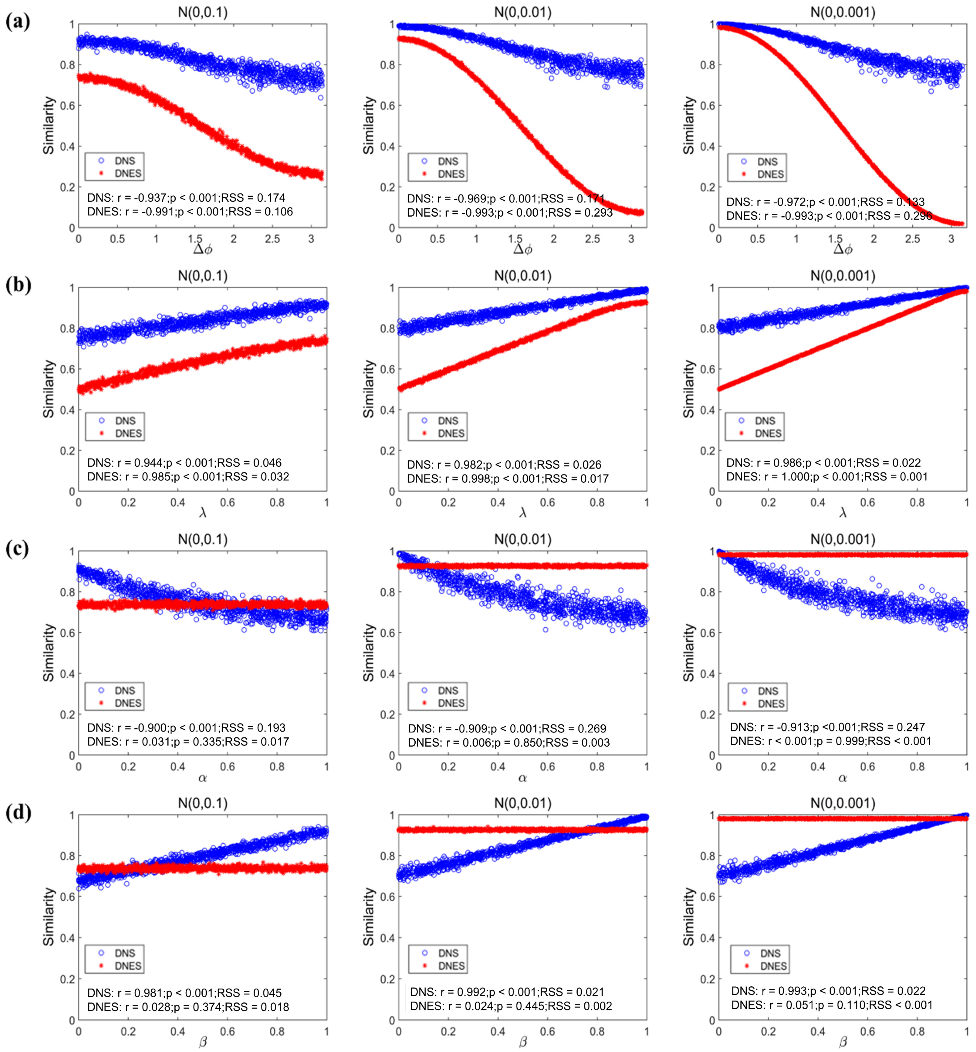 To obtain a sufficient size of samples for adequate statistical power, these experiments were all repeated 200 times. Subsequently, the Pearson correlation between DNS/DNES and the aforementioned variables (Δφ, λ, α, and β) of each feature was calculated to test the sensitivity of DNS and DNES to these individual variables. In addition, the residual sum of squares (RSS) of the linear regression of the DNS and DNES at each SNR level was calculated to test the robustness of DNS and DNES.