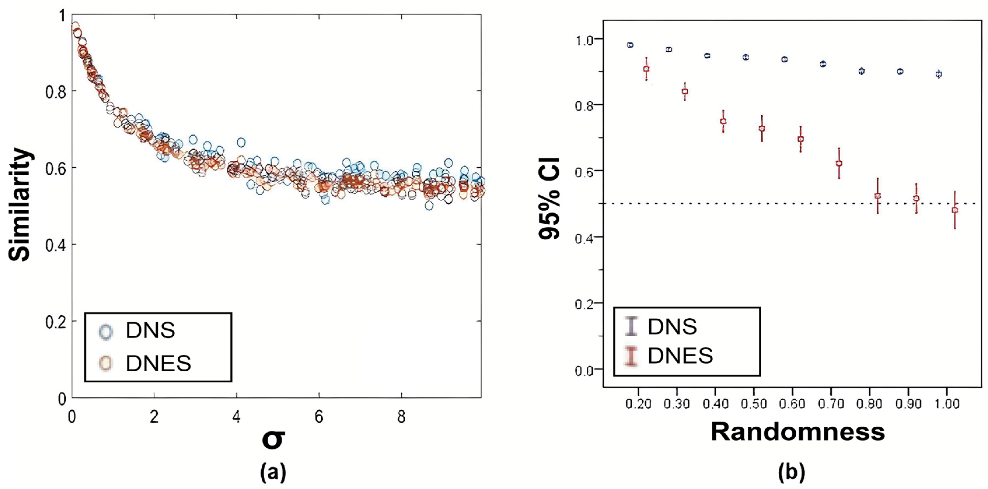 Experiment 5: Gaussian noise was introduced to randomize Dynamic Network 2 to examine the performance of DNS and DNES. Obviously, the similarity between dynamic networks would decrease because of the noise disturbance. To mimic the case of a complete random dynamic network, we used a power of Gaussian noise large enough to affect Dynamic Network 2. Therefore, we set the power of the Gaussian noise , while assuming the power of the signal to be (see Equation (17)) in this experiment. Therefore, 3 levels of Gaussian noise N (0, σ) with σ = 0.1, 0.01, 0.001 were applied to the data to test the robustness of the DNS and DNES.