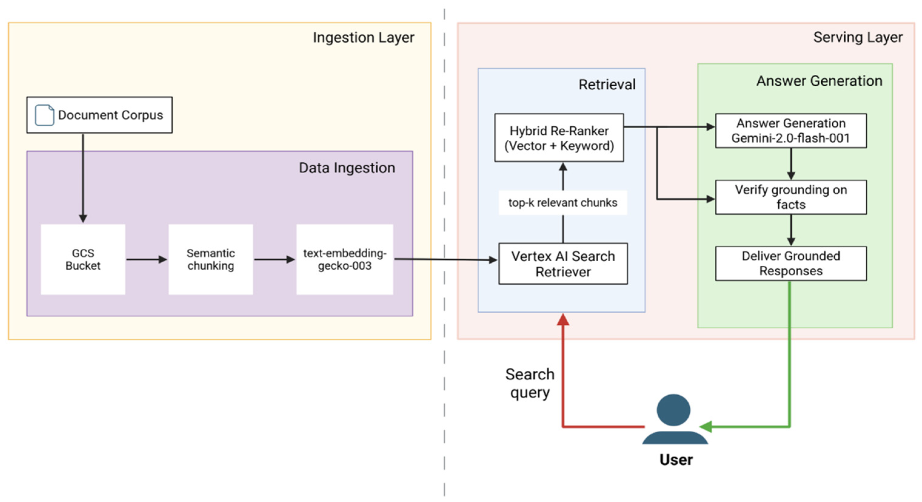 Figure 2. Technical architecture of the AIVA Platform based on Google Vertex AI. The system consists of two main layers: the Ingestion Layer (left) and the Serving Layer (right). In the Ingestion Layer, clinical documents are securely uploaded to a Google Cloud Storage (GCS) bucket, processed using semantic chunking, and converted into embeddings with the text-embedding-gecko-003 model for indexing. In the Serving Layer, patient queries are processed through a Retrieval Path and an Answer Generation Path. The Retrieval Path uses the Vertex AI Search retriever with hybrid re-ranking (vector similarity and keyword-based BM25) to identify the top relevant chunks from the knowledge base. These evidence passages are then passed to the Answer Generation Path, where Gemini 2.0 Flash-001 produces a draft response. Each response undergoes grounding verification against the retrieved evidence and heuristic safety checks before delivering a final, clinically verified answer to the user. Created in BioRender. Haider, S. (2025) https://BioRender.com/7s0m5ii.