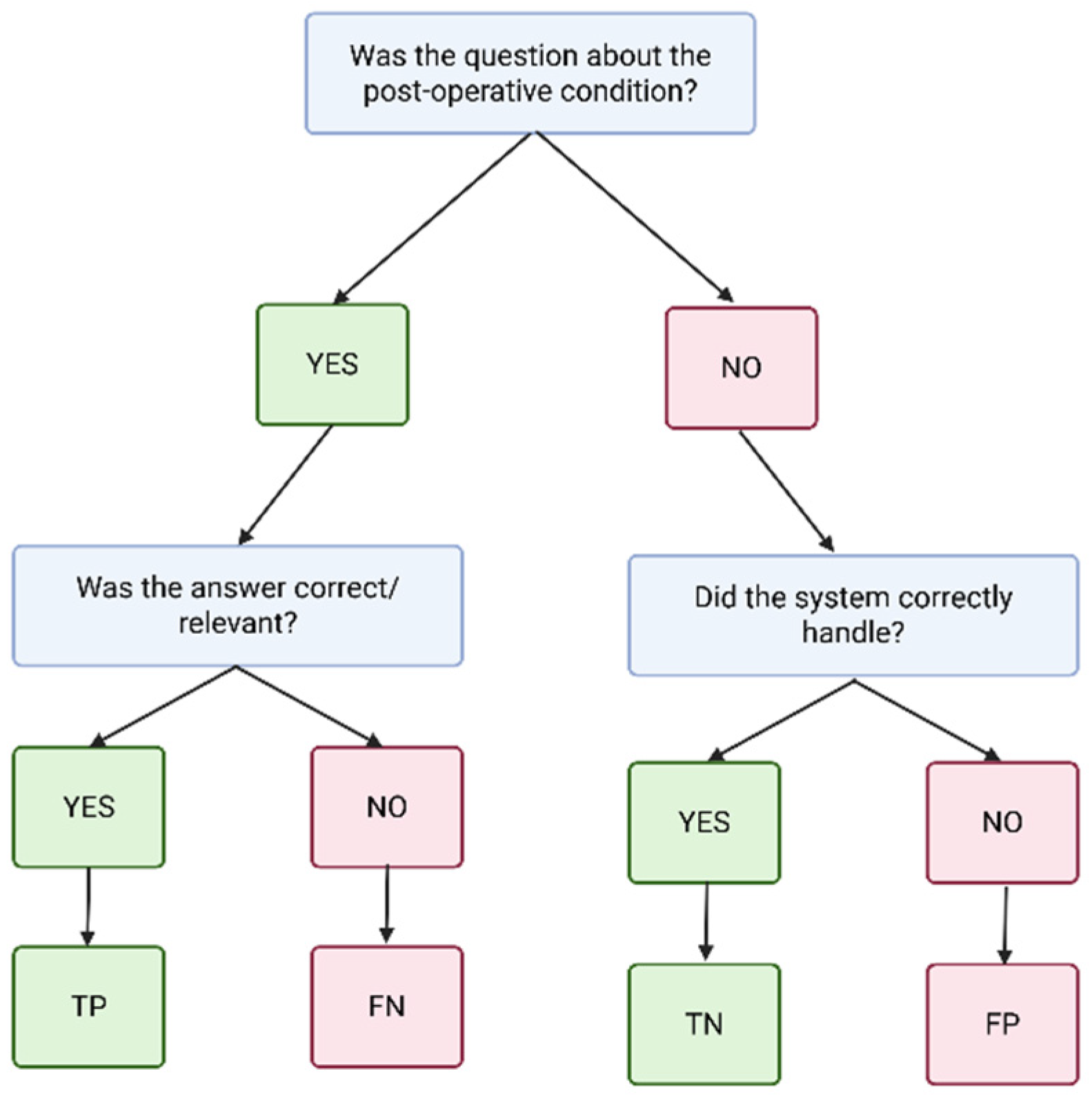 Figure 3. Accuracy classification flow diagram. Responses were categorized into four groups based on reviewer assessment: TP (true positive)—correct in-scope answers; FN (false negative)—in-scope queries where the system failed to provide the correct answer; TN (true negative)—correct rejections of out-of-scope queries; and FP (false positive)—inappropriate answers to out-of-scope queries. Created in BioRender. Haider, S. (2025) https://BioRender.com/jlewnbc.