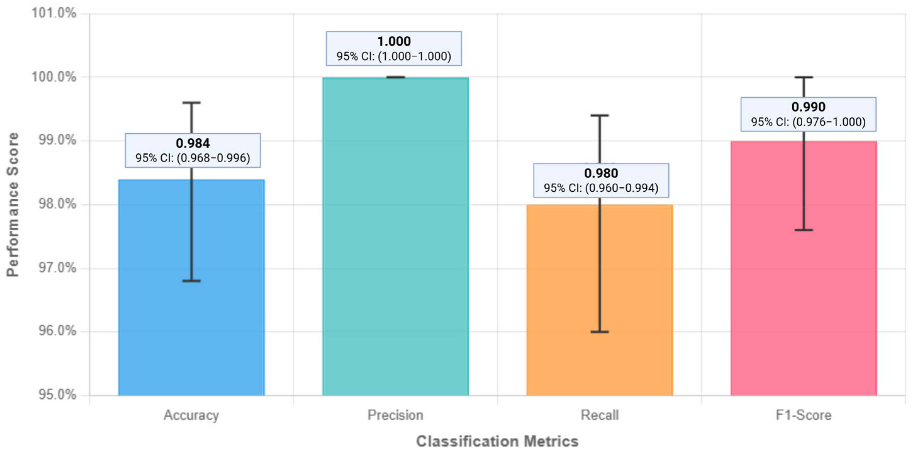 The AIVA Platform demonstrated high classification accuracy across the 250-query core evaluation set. Of these, 196 were true positives (correct in-scope answers) and 50 were true negatives (correct out-of-scope rejections). No false positives occurred, and four responses were false negatives. This yielded an overall classification accuracy of 98.4% (95% CI: 96.8–99.6%) with precision 1.0, recall 0.98 (95% CI: 96.0–99.4%), and F1-score 0.9899 (95% CI: 97.6–100%). The margin of error was ±1.4%, demonstrating statistical precision adequate for proof-of-concept validation. Table 5 summarizes the full confusion matrix, and Figure 4 presents the classification metrics.