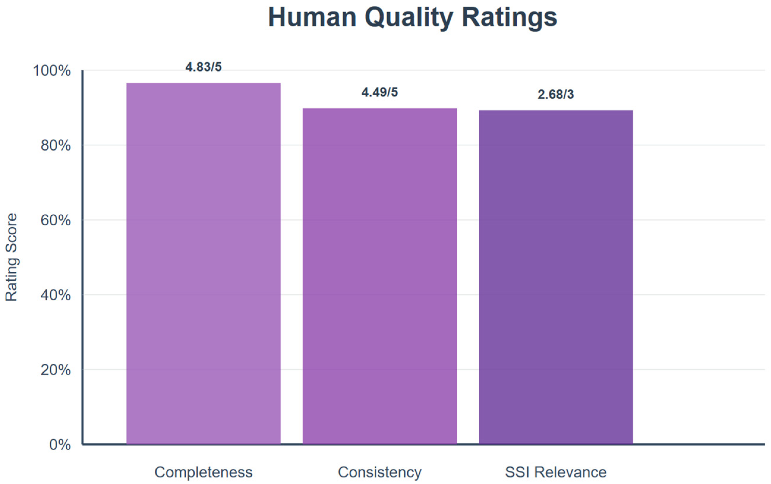 Completeness, on a 5-point Likert scale, averaged 4.83, indicating comprehensive responses. Relevance assessed using the Sensibility–Specificity–Interestingness (SSI) Index (0–3 scale), averaged 2.68 out of 3. Consistency, assessed across paraphrase variants (750 total queries), averaged 4.49/5. Figure 5 presents these detailed human evaluation results.