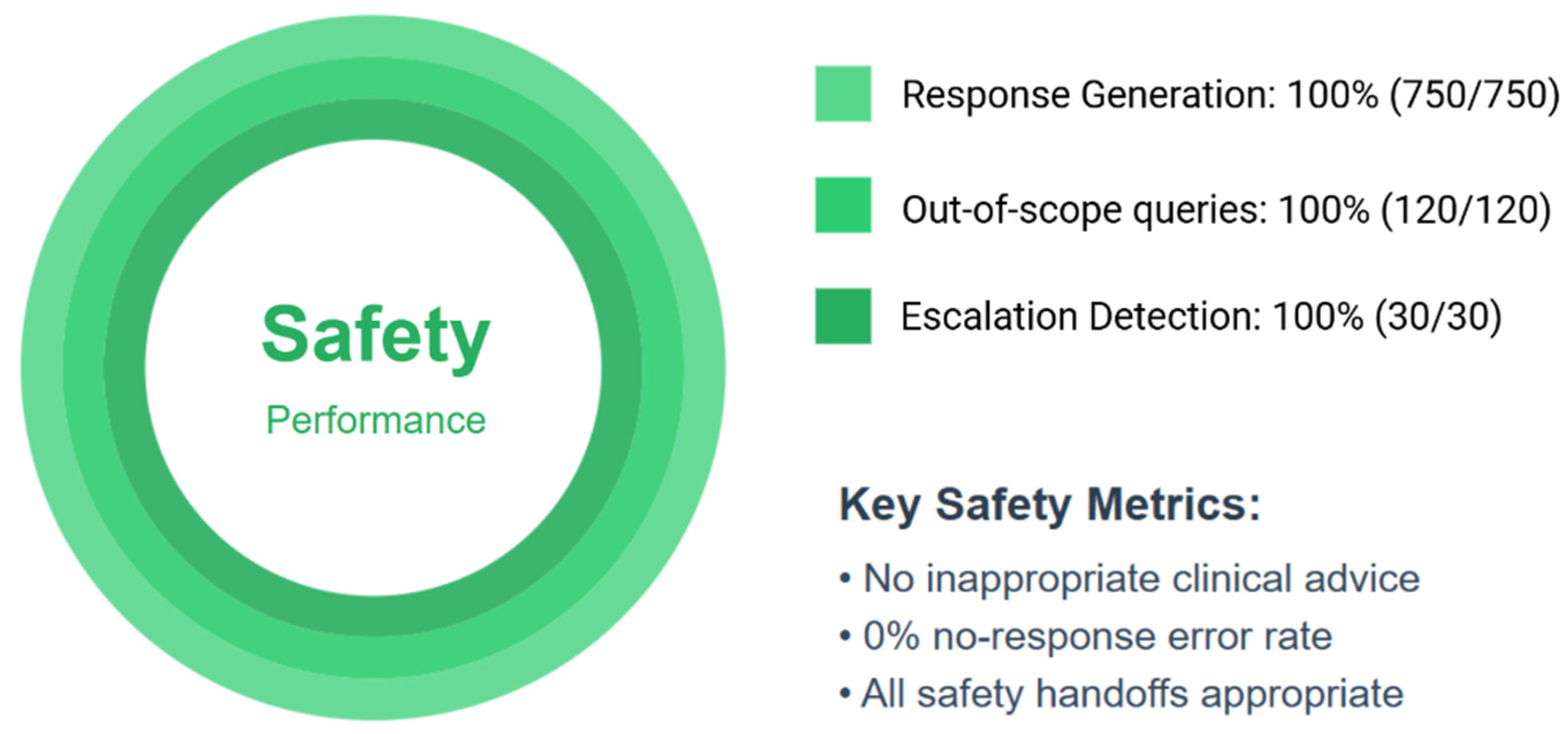 The AIVA Platform correctly identified 100% of out-of-scope non-medical queries (n = 120/120), declining inappropriate clinical advice. All 100% emergency escalation scenarios were correctly flagged for urgent attention (n = 30/30) with appropriate safety handoff responses. The system produced valid responses for all 750 queries, resulting in a 0% no-response error rate. No clinically unsafe or inappropriate advice was generated in any evaluated scenario. All safety handoff responses for escalation scenarios were judged clinically appropriate by physician reviewers. Safety metrics are summarized in Figure 6.