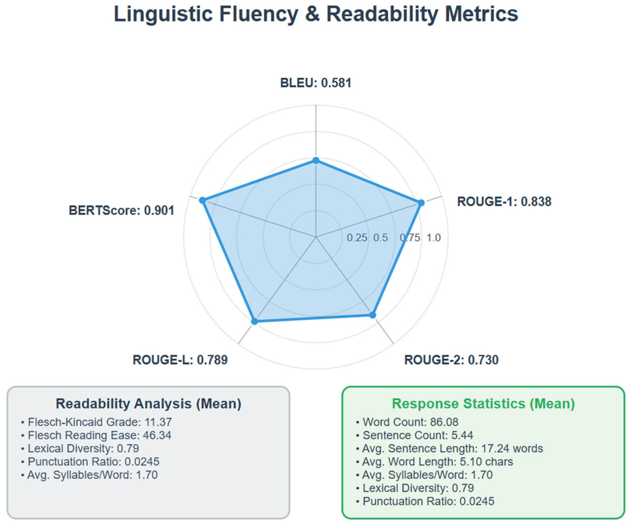 Linguistic fluency was evaluated using multiple natural language generation benchmarks, including BLEU, ROUGE-1, ROUGE-2, ROUGE-L, and BERTScore F1. Additional language structure metrics, such as total word count, sentence count, average sentence length, lexical diversity, and Flesch–Kincaid readability index, were also analyzed.