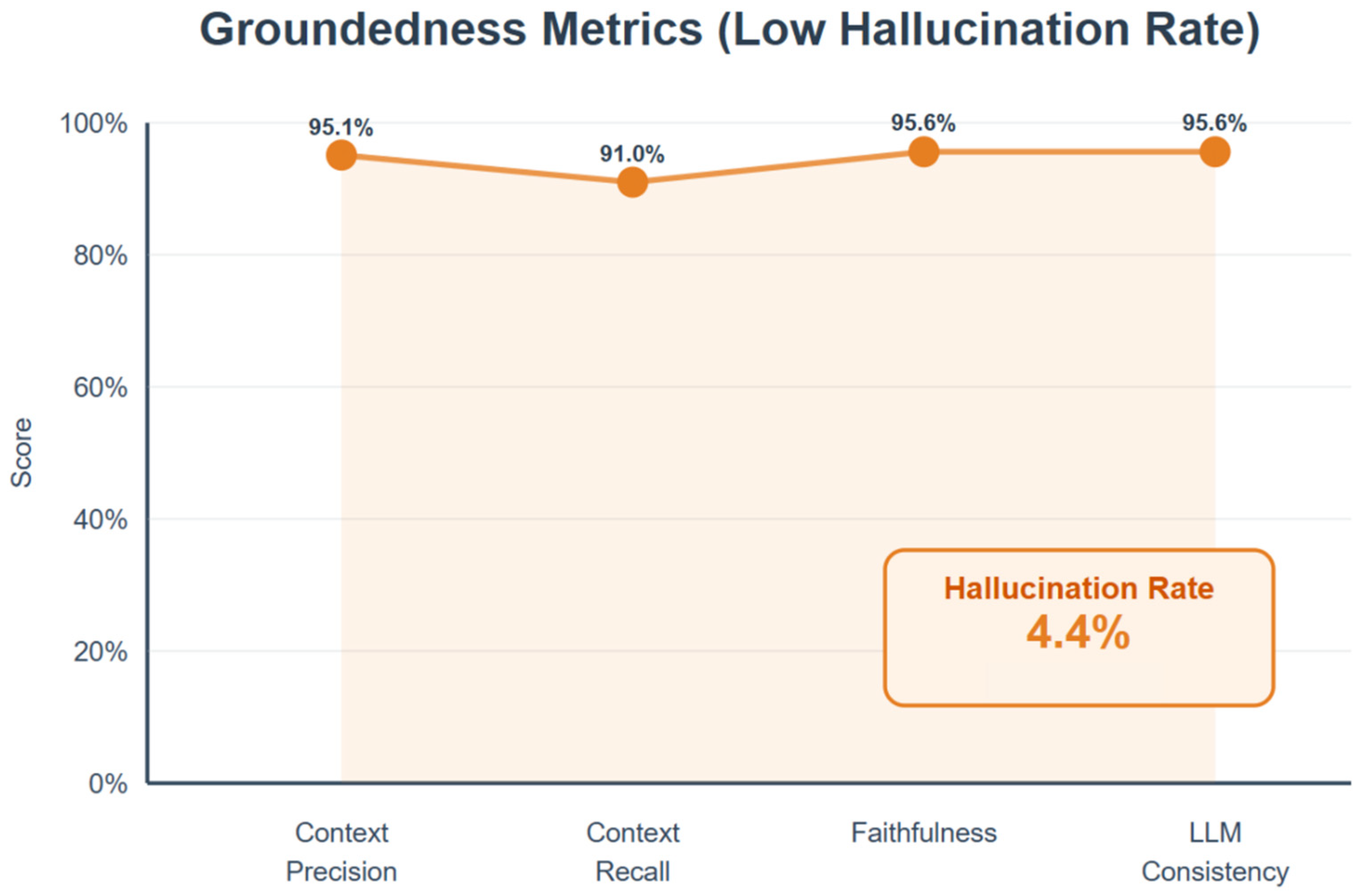Figure 8. Groundedness metrics evaluating factual alignment of system responses. Data labels show context precision = 0.951, context recall = 0.910, and faithfulness = 0.956, corresponding to a hallucination rate of only 4.4%. Independent verification confirmed 95.6% agreement between generated answers and retrieved evidence. Created in BioRender. Haider, S. (2025) https://BioRender.com/3nnu90l.
