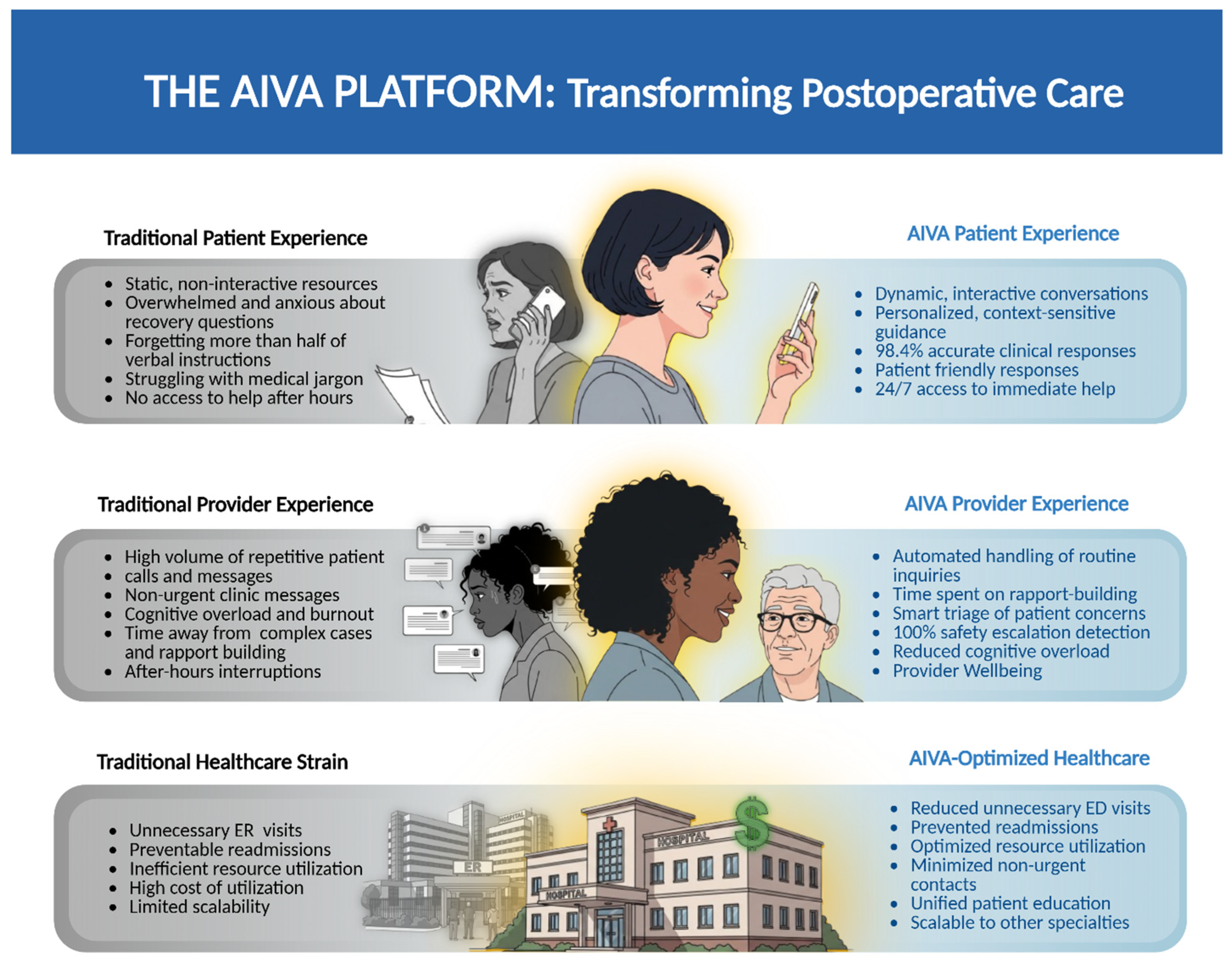 Beyond limited comprehension, these resources also lack adaptability. They cannot adjust to a patient’s specific procedure, stage of recovery, or evolving concerns, resulting in generic guidance that fails to meet diverse needs. This lack of engagement, personalization, and interactivity disproportionately affects vulnerable populations, exacerbating health disparities. Ultimately, these information gaps increase the risk of preventable complications such as medication errors [20], improper wound care [20], and delayed recognition of warning signs [21]. Since well-informed patients make better health decisions, optimizing discharge education is critical to enhancing patient safety, improving outcomes, and strengthening hospital quality metrics. Table 1 summarizes the major limitations of current patient education resources, their impact on patients and providers, and the specific gaps addressed by the AIVA Platform.