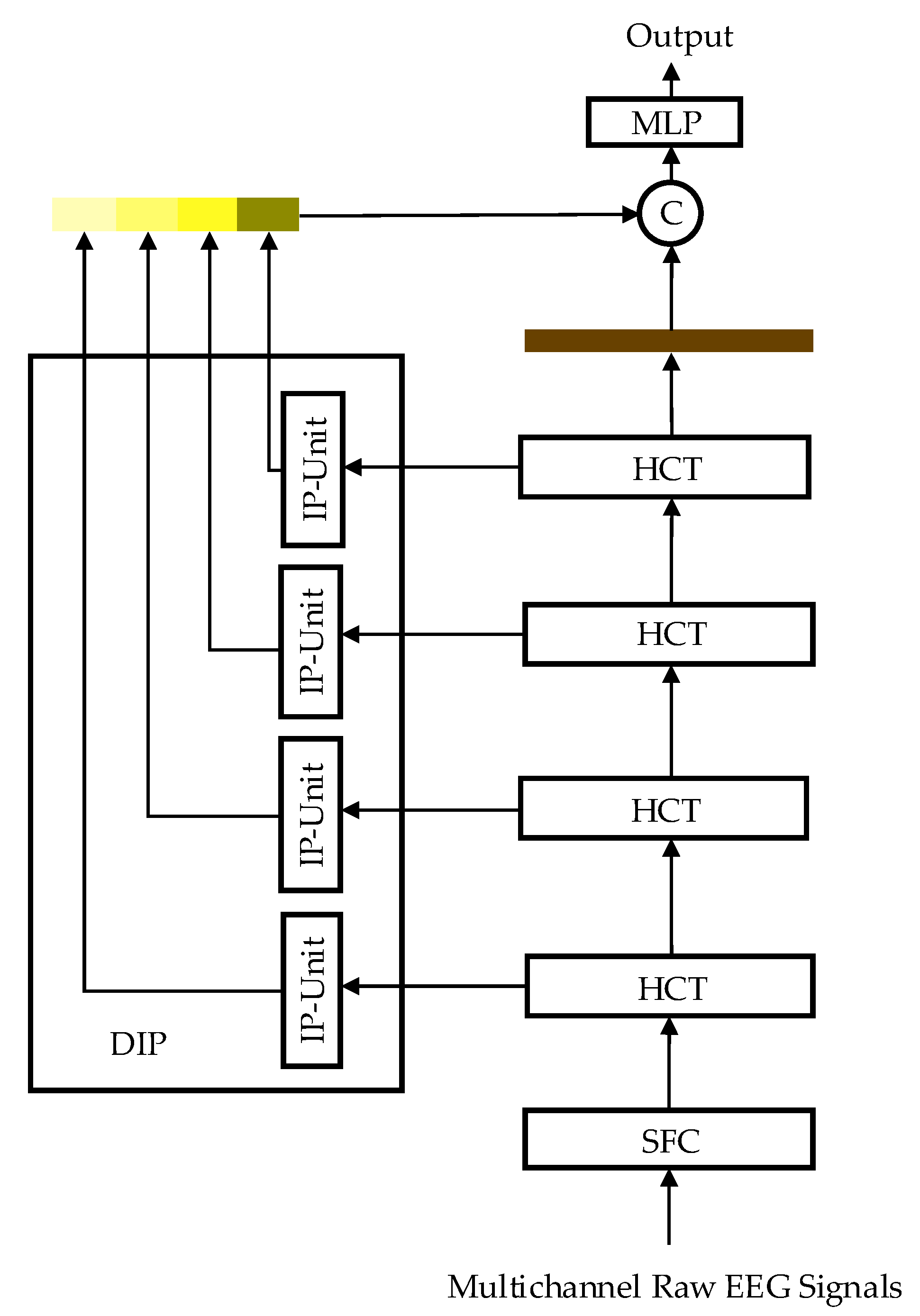 - Ding, Y.; Li, Y.; Sun, H.; Liu, R.; Tong, C.; Liu, C.; Zhou, X.; Guan, C. EEG-Deformer: A dense convolutional transformer for brain-computer interfaces. IEEE J. Biomed. Health Inform. 2025, 29, 1909–1918. [Google Scholar] [CrossRef]