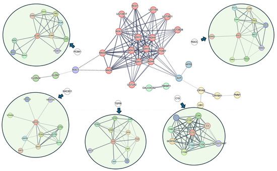 - Szklarczyk, D.; Kirsch, R.; Koutrouli, M.; Nastou, K.; Mehryary, F.; Hachilif, R.; Gable, A.L.; Fang, T.; Doncheva, N.T.; Pyysalo, S.; et al. The STRING database in 2023: Protein-protein association networks and functional enrichment analyses for any sequenced genome of interest. Nucleic Acids Res. 2023, 51, D638–D646. [Google Scholar] [CrossRef]
