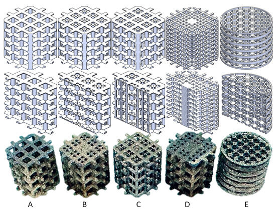 The design logic for these five different structures is based on three factors that need to be balanced: cell/tissue growth, stress shielding, and bone remodeling. Compared to the common scaffold design (structure A), structures B, C, and D incorporate a gradient structure for cell growth, considering that nutrient concentration is distributed in a gradient within the scaffold structure when implanted in human or animal bodies, with the lowest concentration occurring in the middle of the scaffold [