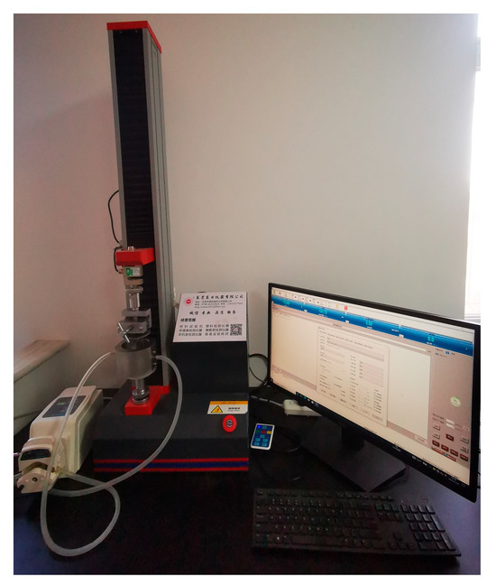 Figure 3. Before starting the experiment, the bioreactor is filled with phosphate-buffered saline (PBS). A peristaltic pump is connected to two chambers, and the other chambers are closed. The loading speed of the plunger is set to 60 mm/min, and the preloading force is 0.1 N. The stroke of the plunger is 3.5 mm, and the precision of the sensor is 0.1% with a maximum range of 5000 N. During the loading test, the peristaltic pump is working to circulate the flow of the PBS in the bioreactor.