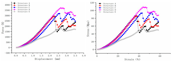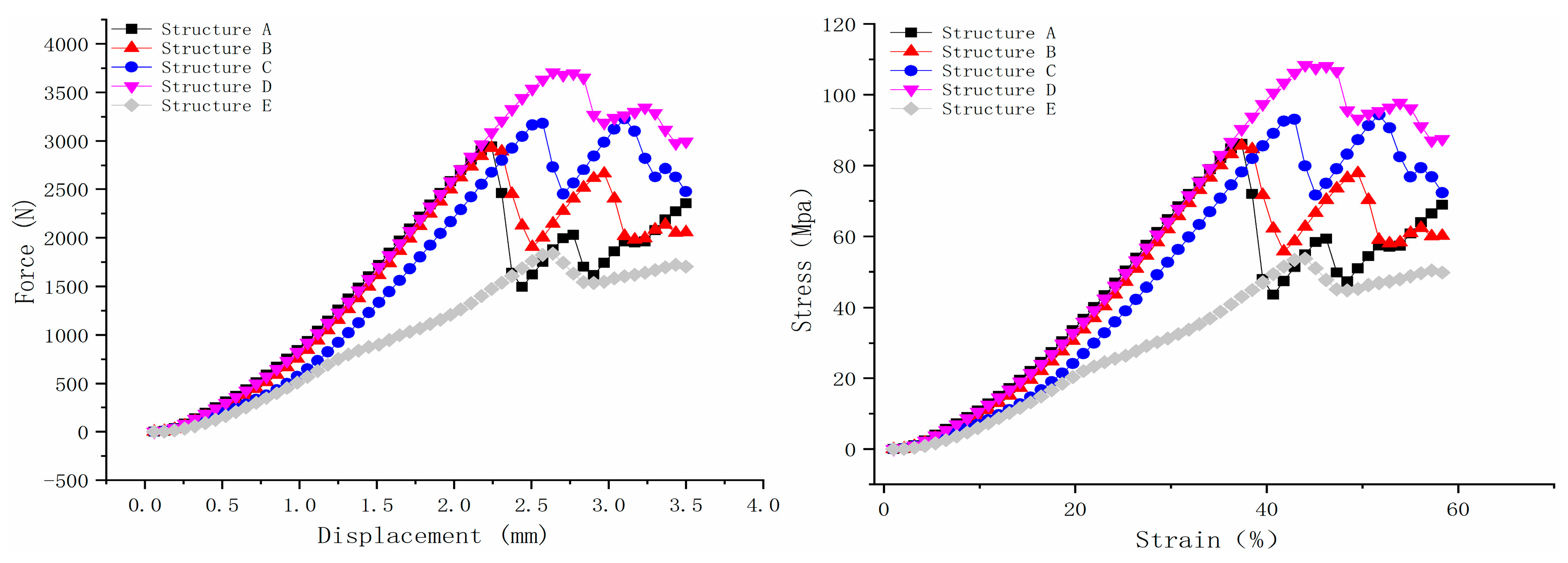 Figure 5. According to the force–displacement curve, structure D exhibited the highest maximum loading force, which was 3707.835 N. Structures A and B demonstrated nearly the same maximum force, which were 2945.087 N and 2931.775 N, respectively. Structure C displayed two peaks, similar to structures A, B, and D, but the second peak’s maximum force was higher than the first peak. After the first peak point, some beams in the scaffold structure would fail. Therefore, the maximum force of structure C was selected as the first peak value, which was 3183.281N. Structure E showed the lowest loading force, which was 1837.402 N.