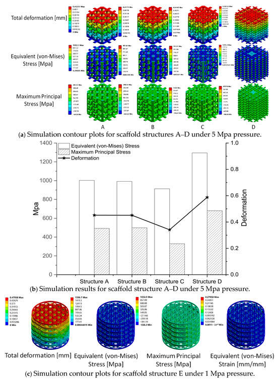 Figure 4, where the loading pressure for structures A–D is 5 Mpa, and for structure E, it is 1 Mpa. The bottom face is set as fixed, simulating the scaffold’s real situation in the bioreactor with displacement in all three directions.