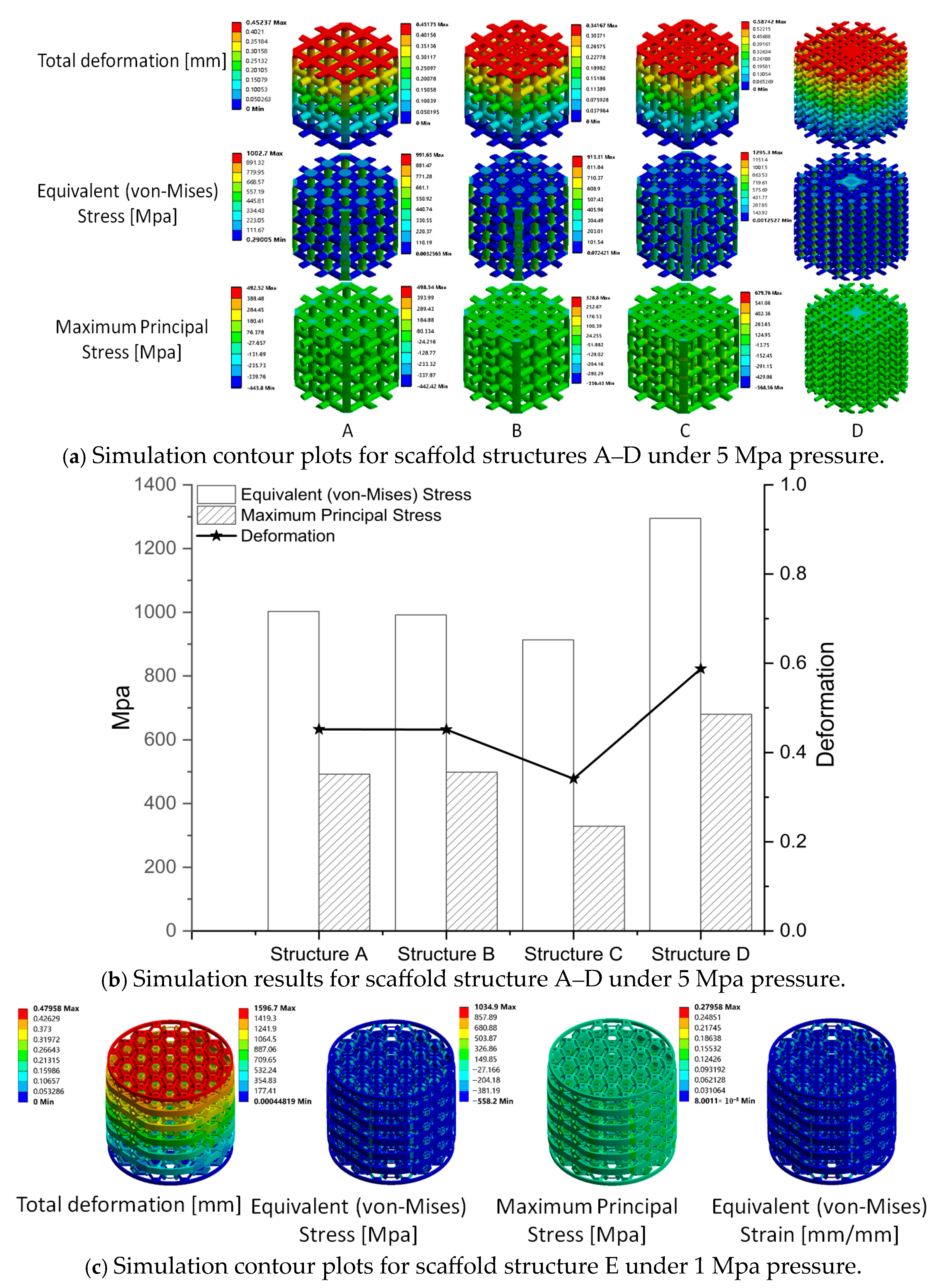 The simulation models aim to investigate the mechanical performance of the scaffold under steady pressure (5 Mpa for scaffold structures A–D and 1 Mpa for scaffold structure E).