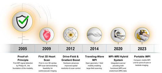 MPI is a relatively new imaging modality that has rapidly progressed from a conceptual discovery to a promising tool for biomedical and cardiovascular applications. Its unique ability to provide quantitative, radiation-free, and high-temporal-resolution imaging has driven growing interest in both preclinical and translational research. This section outlines the historical milestones and key technological developments that have shaped the evolution of MPI into a potential next-generation technique for cardiovascular imaging.