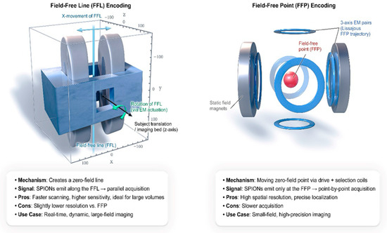 To make high-resolution images, frequency domain filtering is used to detect and separate the higher-order harmonics, primarily the odd harmonics of the fundamental drive frequency, which the SPIONS generate at the FFP or FFL. Recent FFL encoding schemes boost sensitivity and enable computationally efficient Radon transform reconstruction [38]. The FFP is moved across the volume of interest either mechanically or magnetically to accomplish spatial encoding [24,25]. Figure 2 illustrates the difference between FFP and FFL encoding strategies. It demonstrates how various types of scanners affect acquisition speed, resolution, and use cases.