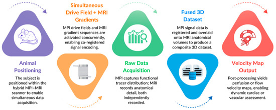 Additionally, it was possible to estimate derived parameters such as cardiac output fractions and pressure gradients based on these large-vessel velocity measurements. The MPI-MRI hybrid imaging system, therefore, enabled the rapid, noninvasive, and quantitative assessment of central hemodynamic parameters in situ, which may have future applications in ICU patients’ post-coronary artery bypass surgery, during cardiogenic shock, or for early stage cardiovascular disease monitoring [57]. The integrated acquisition and co-registration process of the hybrid MPI-MRI pipeline is visualized in Figure 3, demonstrating a streamlined workflow from animal setup to fused velocity map output.