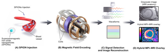 To provide a clearer conceptual overview of how the imaging pipeline operates, Figure 4 illustrates the complete schematic workflow of MPI from tracer injection to hybrid image formation. It highlights each step of the process, beginning with SPION administration, magnetic field encoding, and signal reconstruction, and concluding with a hybrid MPI-MRI overlay for anatomical correlation. This schematic complements the experimental workflow shown in Figure 3 by summarizing the technical sequence common to both preclinical and hybrid MPI-MRI applications.