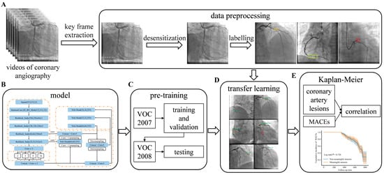 Overall workflow diagram for intelligent diagnosis and prognostic assessment based on Coronary Angiography image analysis. The study workflow encompasses five main phases, from video data processing to model construction, pre-training, transfer learning, and final prognostic analysis. (A) Data Preprocessing. Key frames are extracted from coronary angiography videos, undergo desensitization, and are labeled for subsequent training. Colored Labeling Key: In the “labelling” step, colored boxes are used to mark different types of coronary lesions. Dark yellow presents limited meaningful lesions; Light green presents diffuse lesions; Red presents completely occlusive lesions. (B) Model. The architecture utilizes the improved YOLOv4 object detection algorithm. (C) Pre-training. The model is trained using the VOC 2007 dataset for training and validation, and the VOC 2008 dataset for testing, to acquire robust initial weights. (D) Transfer Learning: The pre-trained model is fine-tuned and tested on the clinical Coronary Angiography dataset. (E) Kaplan-Meier Analysis. Quantitatively assesses the correlation between algorithmically derived coronary artery lesion characteristics and the incidence of MACEs for prognostic evaluation.