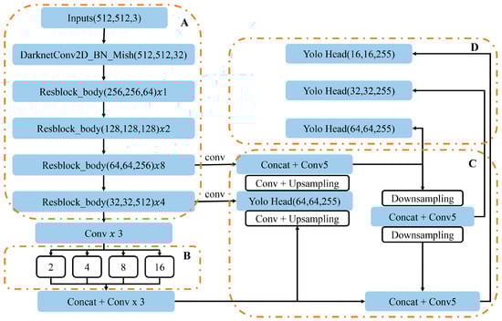 Diagram of the improved YOLOv4 model. (A) CSPDarknet53 Backbone. The feature extraction network that processes the Inputs (512, 512, 3) image and yields features at various scales. (B) Modified Spatial Pyramid Pooling (SPP) Module. The pooling layer sizes are optimized to 1, 2, 4, 8, and 16, enhancing the model’s multiscale feature aggregation capacity for accurate localization of variably sized lesions. (C) Path Aggregation Network (PANet). The feature aggregation modules that fuse high-level and low-level features through convolution, upsampling, downsampling, and concatenation to enrich the feature map. (D) YOLO Detection Heads. The standard detection heads that output final predictions (bounding boxes and classification) at three different scales (e.g., (16, 16, 255), (32, 32, 255), and (64, 64, 255)).