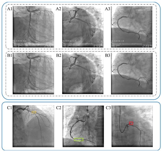 Coronary angiography image desensitization and labelling. (A1–A3). Original images of coronary angiography from patients. (B1–B3). Desensitization of relative original images. (C1–C3). Labelling of the narrowed coronary arteries image, dark yellow in (C1) presents limited meaningful lesion, light green in (C2) presents diffuse lesion, red in (C3) presents completely occlusive lesions.