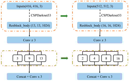 To achieve the requisite high detection accuracy for processing complex coronary angiography (CAG) images, we implemented targeted structural modifications to the baseline YOLOv4 architecture. These enhancements were specifically engineered to address the challenges posed by multiscale lesions. The main modifications were twofold: first, the model’s input resolution was upscaled from 416 × 416 pixels to 512 × 512 pixels, a change that provides a richer contextual and spatial feature map crucial for resolving small-sized lesions. Second, we significantly optimized the Spatial Pyramid Pooling (SPP) module by replacing the standard pooling layer sizes with a refined sequence of kernel dimensions: 1 × 1, 2 × 2, 4 × 4, 8 × 8, and 16 × 16. This particular adjustment was designed to fundamentally boost the network’s multiscale feature representation capability, thereby enhancing its robustness and accuracy in detecting coronary lesions that exhibit wide variations in size. The schematic diagrams of the SPP module before and after improvement are shown in Figure 5.