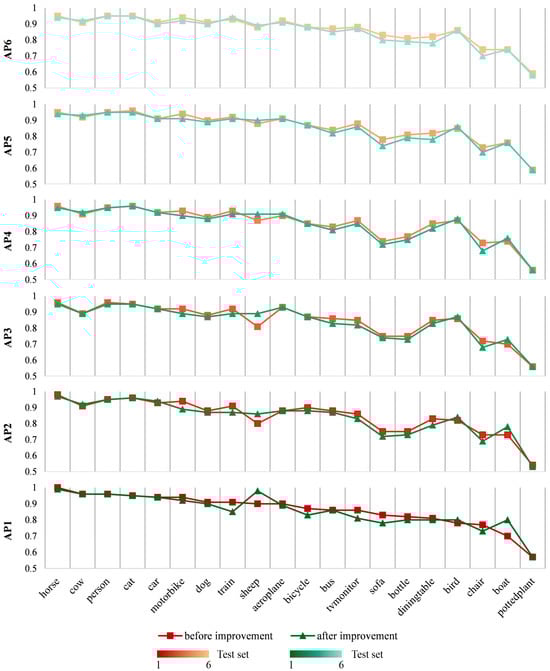 To validate the efficacy of the structural optimizations, the modified model’s performance was first assessed on the established VOC datasets. The mean Average Precision (AP) for the pre-modification baseline model was 85.43% (95% CI: 84.12–86.73%). Following the implementation of the structural adjustments, the AP was measured at 84.72% (95% CI: 83.44–85.99%). This comparison demonstrated that the improved architecture maintained a substantially comparable detection performance for the large-scale object categories characteristic of the VOC dataset, showing no significant increase in performance. This outcome is consistent with the primary design objective: the architectural modifications were specifically engineered to enhance the model’s ability to recognize small-scale objects (i.e., coronary lesions) rather than providing a generalized improvement for large-object detection tasks. The detailed verification results are shown in Figure 6.
