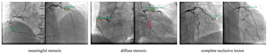 A total of 563 patients diagnosed with Acute Myocardial Infarction (AMI) were initially screened. Following the application of predefined exclusion criteria and subsequent accounting for patient loss to follow-up, a final cohort of 408 patients was included for comprehensive analysis. From this final cohort, 1273 distinct coronary angiography (CAG) images were compiled and integrated into the image analysis study. The detailed clinical characteristics and statistical outcomes regarding the follow-up incidence of Major Adverse Cardiovascular Events (MACEs) for this patient population have been previously reported []. To prepare the data for the deep learning model, all acquired CAG images underwent desensitization (removal of patient-identifying information) prior to lesion annotation. Coronary lesions were manually labeled, with a definition of significant stenosis established as a narrowing of the coronary artery diameter exceeding fifty percent (≥50). The final annotated images, illustrating the various lesion types, are presented in Figure 4.