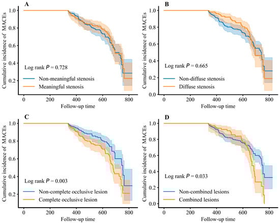 Association between coronary lesions and MACE occurrence in AMI patients. (A) Association between meaningful stenosis lesions and MACEs. (B) Association between diffuse stenosis lesions and MACEs. (C) Association between complete occlusive lesions and MACEs. (D) Association between combined lesions and MACEs. AMI: acute myocardial infarction, MACEs: major adverse cardiovascular events. The shaded area around the curve represents the 95% confidence interval.