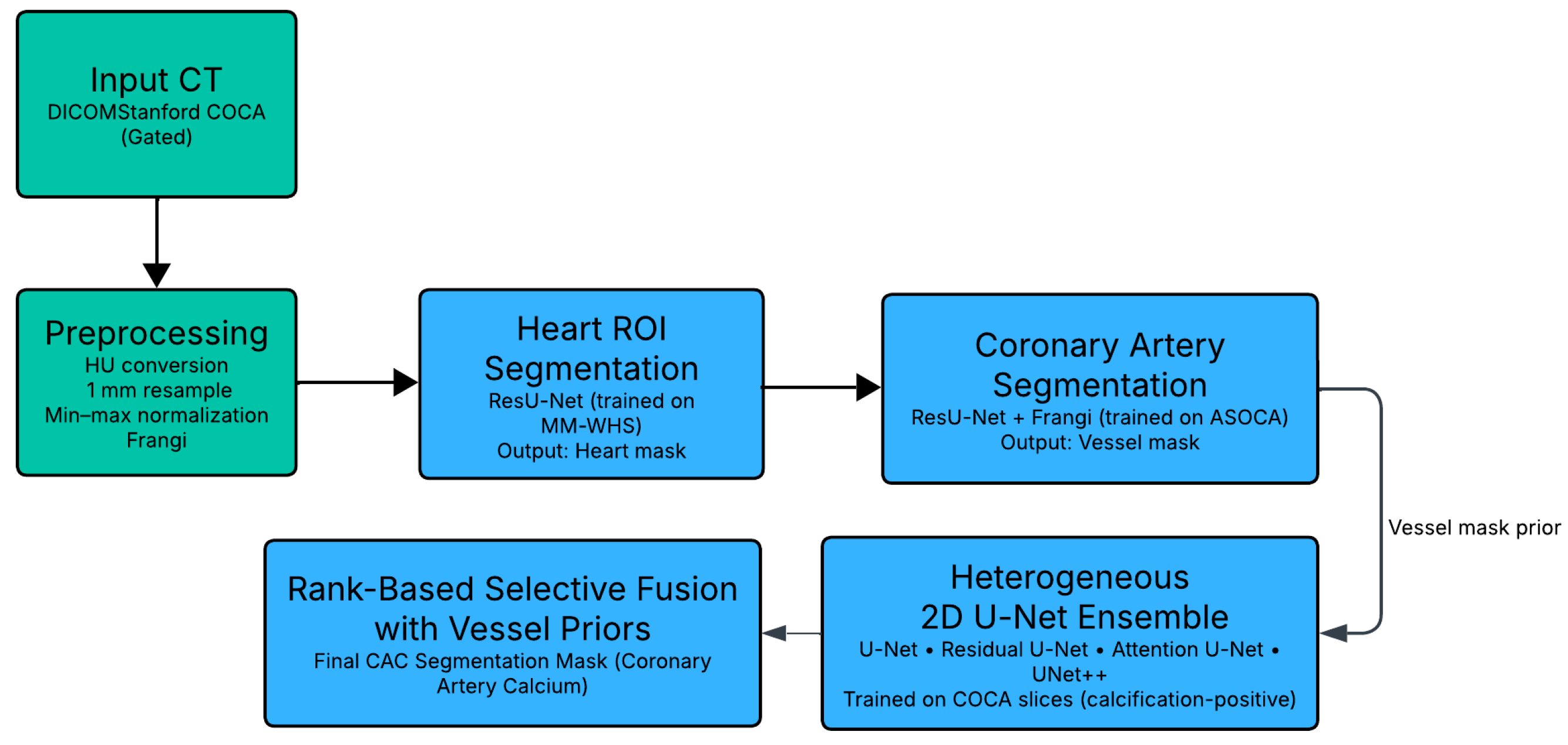 The cascaded segmentation stage proceeds hierarchically to capture different anatomical levels, beginning with heart region extraction, followed by coronary artery segmentation, and concluding with calcification detection. A ResU-Net trained on the MM-WHS dataset isolates the heart region of interest (ROI), while a second ResU-Net trained on the ASOCA dataset segments the coronary arteries, generating vessel priors that guide subsequent lesion detection. Finally, calcified plaques are segmented within the vessel-constrained ROI using an ensemble of heterogeneous U-Net variants; U-Net, Residual U-Net, Attention U-Net, and UNet++. Their outputs are fused using a rank-based selective ensemble strategy that prioritizes anatomically consistent predictions and suppresses false positives. This hierarchical, anatomically informed design ensures that the proposed framework achieves accurate, vessel-aware CAC segmentation, laying the foundation for automated calcium burden quantification and supporting more precise cardiovascular risk assessment.