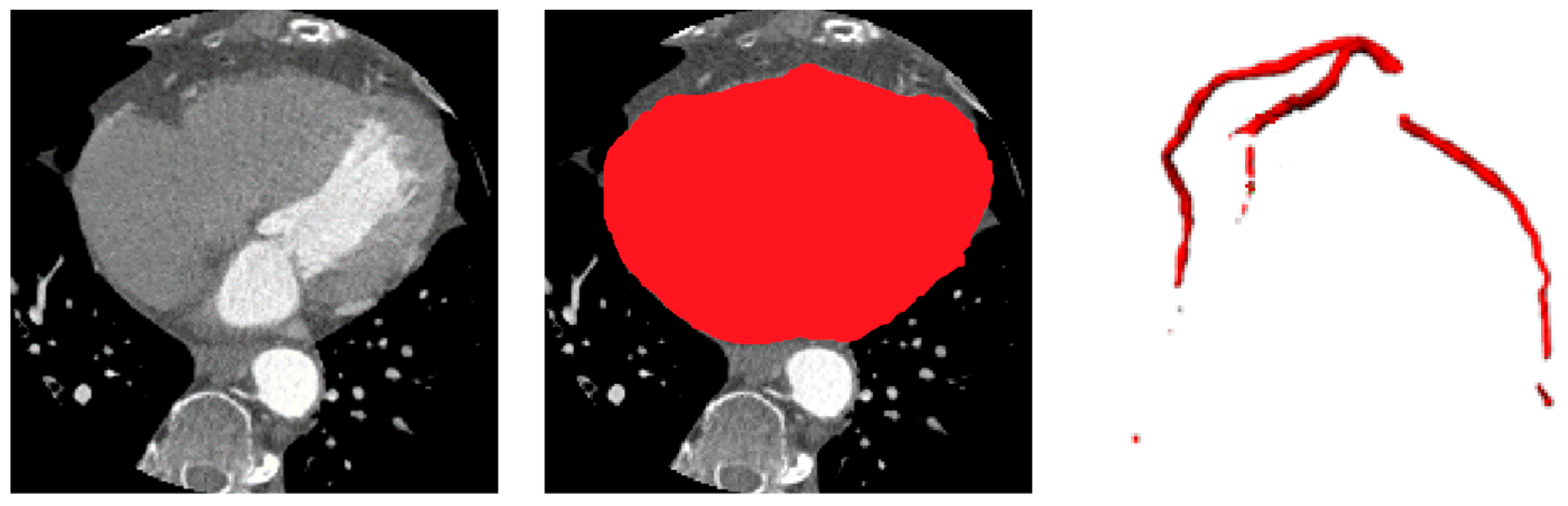 The vesselness-enhanced inputs allow the ASOCA-trained ResU-Net to delineate coronary arteries more accurately, even in regions with low contrast-to-noise ratio. When applied to the gated COCA CT scans—cropped to the heart ROI—the resulting vessel masks serve as anatomical constraints for the downstream calcification segmentation stage. These vessel priors ensure that detected lesions are spatially restricted to plausible coronary regions, reducing false positives near the aorta, valves, or pericardium and improving the sensitivity and specificity of calcification segmentation. Examples of the heart and coronary arteries segmentations are shown in