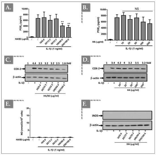 In C28/I2 chondrocytes, treatment with HA/B3 at high doses (i.e., ≥100/66.6) resulted in a reduction in PGE2 production (Figure 3A) and COX-2 protein expression (Figure 3C).
