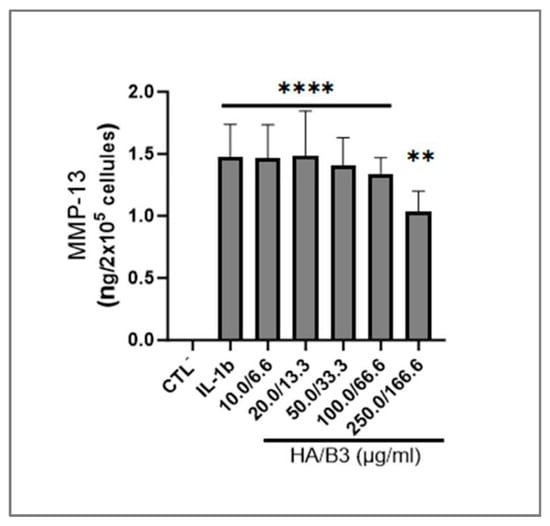 Investigation of the expression of MMP-13 in C28/I2 chondrocytes. The cells were pretreated with increasing concentrations of HA/B3 for 2 h. They were induced with 1 ng/mL IL-1β. After 1 h incubation at 37 °C, volumes of 20 μL of treated cell culture medium (i.e., 10-fold dilution) were used for ELISA quantification of MMP-13. Statistically significant differences (i.e., **** or p-value < 0.0001; ** or p-value < 0.01) are outlined between the groups. Data are expressed as the mean of three independent tests and analyzed by one-way ANOVA (i.e., with a post hoc Tukey test). ELISA, enzyme-linked immunosorbent assay; HA, hyaluronic acid; IL, interleukin; MMP, matrix metalloproteinase.