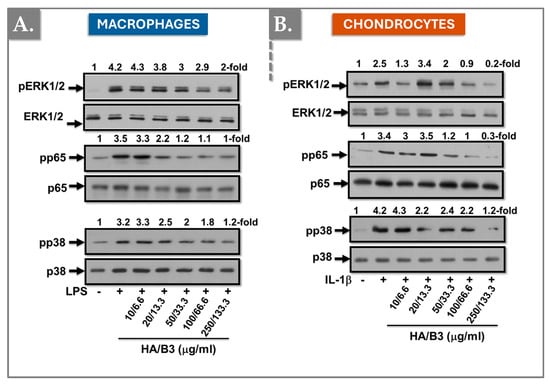 To further investigate the specific signaling pathways implicated in catabolic and inflammatory responses, Raw 264.7 macrophages and C28/I2 chondrocytes were pre-treated with increasing concentrations of HA/B3 for 2 h. Subsequently, macrophages were stimulated with 50 ng/mL LPS, and chondrocytes were stimulated with 1 ng/mL IL-1β. Cells were then incubated for 1 h at 37 °C in a humidified atmosphere containing 5% CO2. Cell lysates were collected using Laemmli buffer, and 15 μL samples were used to determine mitogen-activated protein kinase (MAPK) content. Figure 6 demonstrates that the HA/B3 combination effectively downregulated the active phosphorylated forms of ERK1/2 and p38 MAPK, as well as p65/NF-κB, in both cell lines.