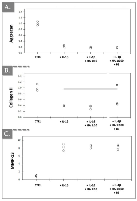 Effects of HA/B3 combinations on IL-1β-mediated hypertrophic-like changes in rat chondrocytes (N = 3), assessed by chondrogenic gene expression analysis. Rat chondrocytes were incubated with or without test compounds along with IL-1β. Relative normalized expression levels of aggrecan (A), type II collagen (B), and MMP-13 (C) were determined using RT-qPCR analysis. Expression levels were normalized against reference genes (i.e., β-actin and RPL19) and compared to expression levels in IL-1β-treated chondrocytes. Statistically significant differences (i.e., * or p-value < 0.05) were evidenced between the groups (i.e., with a Mann–Whitney test). HA, hyaluronic acid.