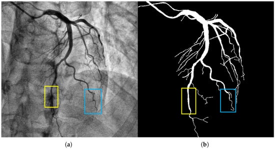 Coronary vessels have a tree-like topological structure. The distal end of the aorta can be divided into the left anterior descending branch, the left circumflex branch, the right coronary artery, etc., as the main branches, and each branch is further divided into multiple levels of fine branches (as shown in Figure 1, the blue box). The projection characteristics of two-dimensional DSA images cause the superimposition of different depths of vascular branches, which alters the uniform change trend of vascular diameters and increases the difficulty of segmentation [,,,,]. Moreover, areas with vascular intersections and bends are prone to sudden drops in gray values, making it difficult for traditional models to maintain segmentation connectivity. Therefore, a specially designed long-distance dependent modeling module is required to restore the dendritic structure of the blood vessels.