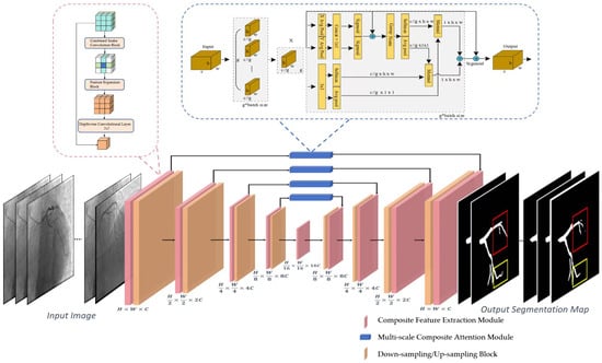 The proposed coronary artery segmentation network is architected upon a U-shaped symmetrical encoder-decoder framework, fundamentally enhanced by the integration of our novel Composite Feature Extraction Module (CFEM) and Multi-scale Composite Attention Module (MCAM) (Figure 4). This architecture is characterized by: