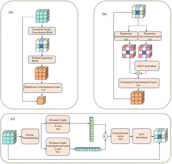 This figure illustrates the design of the CFEM. Panel (a) shows the Combined Snake Convolution Block, followed by the Feature Expansion Block and Depthwise Convolutional Layer, which enhance feature extraction. Panel (b) demonstrates the expansion-contraction path using 1 × 1 convolution layers, with CELOU activation, adapting to varying vessel scales. Panel (c) depicts the directional dynamic snake convolutions along the x and y axes, integrated with group normalization and a 3 × 3 convolutional layer. The CFEM improves the representation of vascular morphology and scale consistency, significantly boosting segmentation accuracy and robustness.