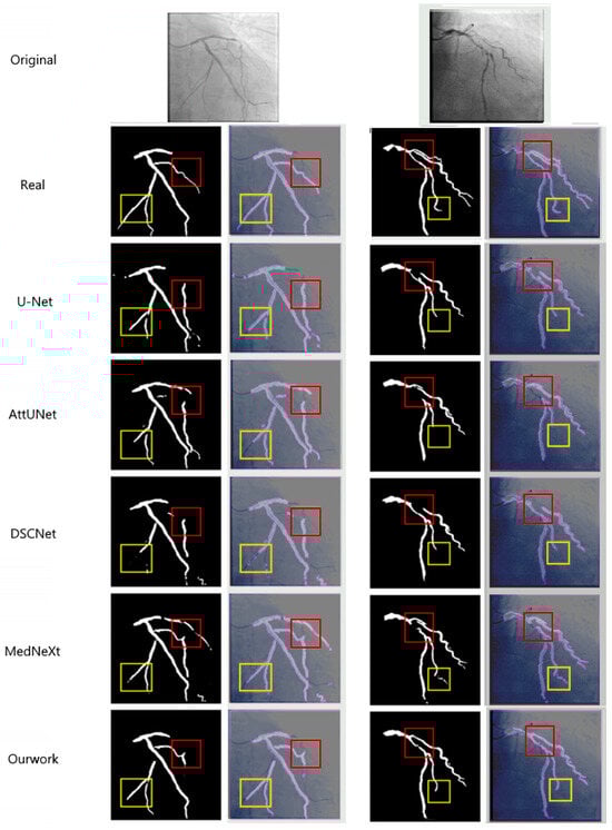 The segmentation comparison in Figure 6 demonstrates the superior performance of the proposed method across multiple models, including U-Net, AttUNet, DSCNet, and MedNeXt [,]. The figure presents the original DSA images and corresponding ground-truth labels (Real), followed by the segmentation results obtained by each model. The comparison methods generally have segmentation breakage phenomena, especially SPNet []. Due to its strip-shaped pooling, it is only applicable to linear objects. It is difficult to handle the dendritic vascular structure, resulting in the poorest connectivity of the segmentation results. Compared with the reference methods, our network shows notably better delineation of fine vascular branches (highlighted by the yellow boxes), where U-Net and AttUNet exhibit omissions and MedNeXt and DSCNet produce partial discontinuities. Moreover, our method maintains stronger connectivity in regions of vascular intersections and curvature (marked by the red boxes), effectively suppressing background artifacts and false detections. These improvements confirm that the synergistic integration of the CFEM and MCAM enable more precise modeling of vessel morphology, resulting in enhanced continuity and topological integrity of the segmented coronary arteries.