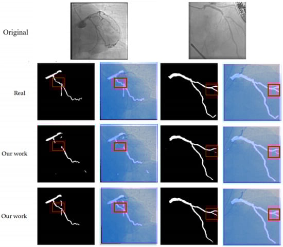 This figure compares the segmentation results of our method with the ground truth (Real) and the results from other models (Our work). The first row shows the original images. The second and third rows display the segmentation outputs, where the red boxes highlight areas of interest. Our method (shown in the second and third rows) provides more accurate and continuous segmentation, particularly in complex regions, compared to the ground truth and other models. This demonstrates the effectiveness of our approach in handling fine branches and vascular intersections.
