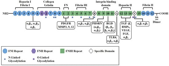 FN serves as a multifunctional ligand through its interaction with various ECM components, including integrins, collagen, fibrin, glycosaminoglycans (GAGs), and growth factors (e.g., TGF-β, VEGF) []. Post-translational modifications, including glycosylation and phosphorylation, may further influence FN’s functional properties [,,]. The structure of FN and associated binding/glycosylation sites are shown in Figure 1.