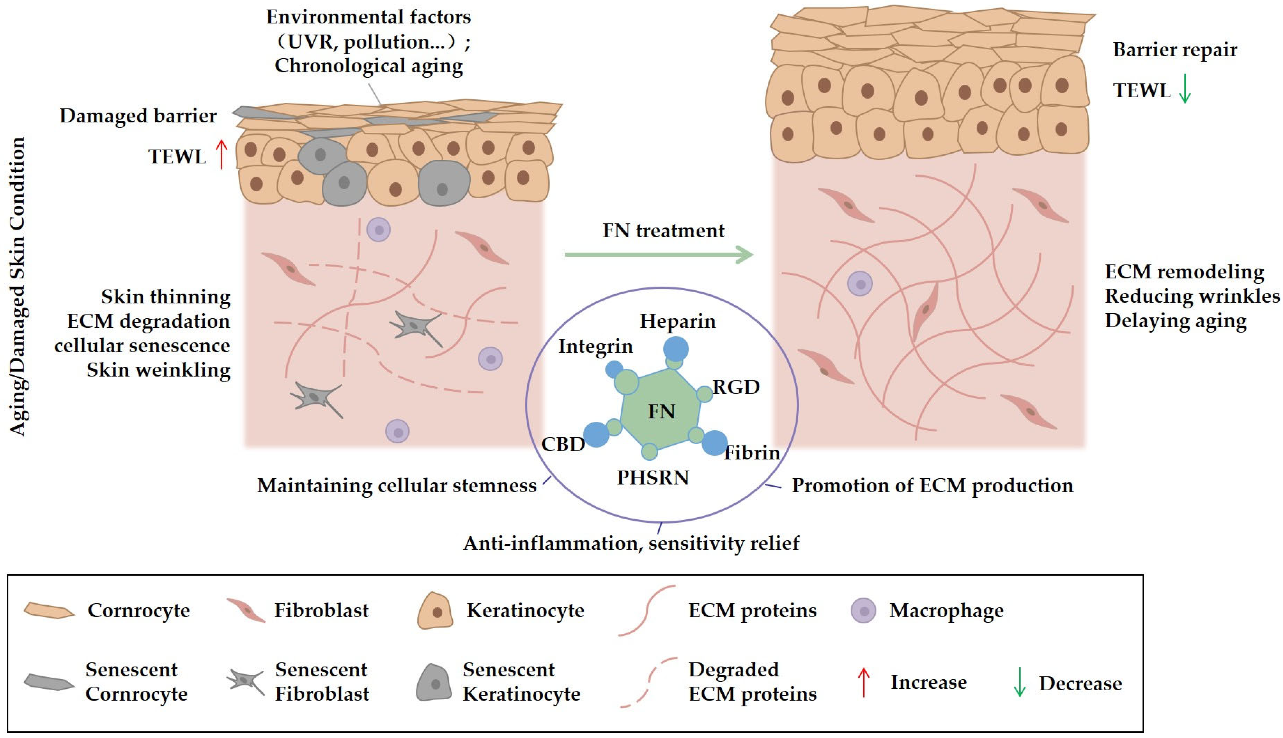 - Wang, Y.; Zhang, Q.; Liao, H.; Lu, X.; Cong, J.; Liu, Z.; Liu, Q.; Deng, C.; Cheng, Y.; Shu, P.; et al. Anti photoaging mechanism of a novel recombinant human fibronectin peptide (rhFNP) derived from the extracellular matrix. Heliyon 2025, 11, e42730. [Google Scholar] [CrossRef] [PubMed]