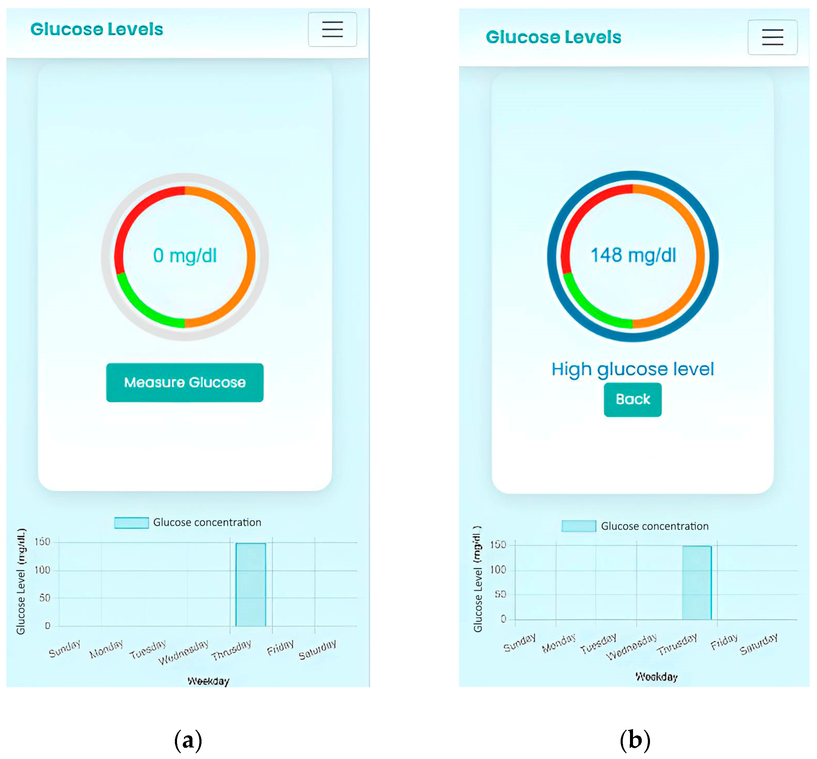 Glucose solutions with concentrations of 2 mM and 6 mM were tested, representing glucose levels under hypoglycemic and hyperglycemic conditions. The results demonstrated a direct correlation between glucose concentration and the intensity of the color generated in the enzymatic reaction, confirming the device’s sensitivity in measuring glucose levels.