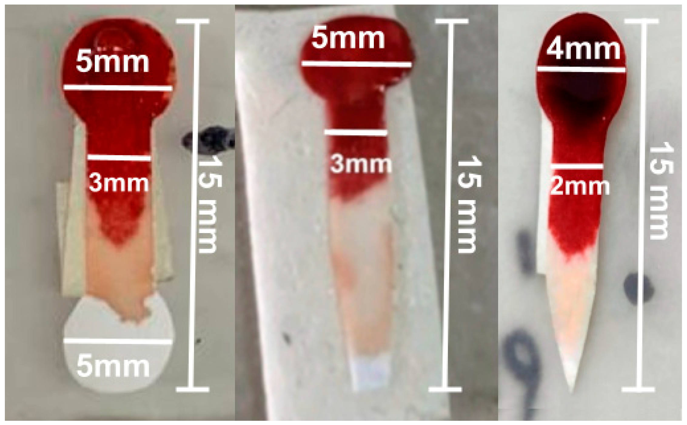 For the comparative evaluation of the different types of paper, the main criterion was the ratio of paper pore size to the cellular dimensions of the blood components, primarily erythrocytes (~7 µm), leukocytes (8–20 µm), and platelets (~3 µm). Both pore size and paper thickness were considered critical parameters to ensure efficient cell retention without compromising capillary flow.