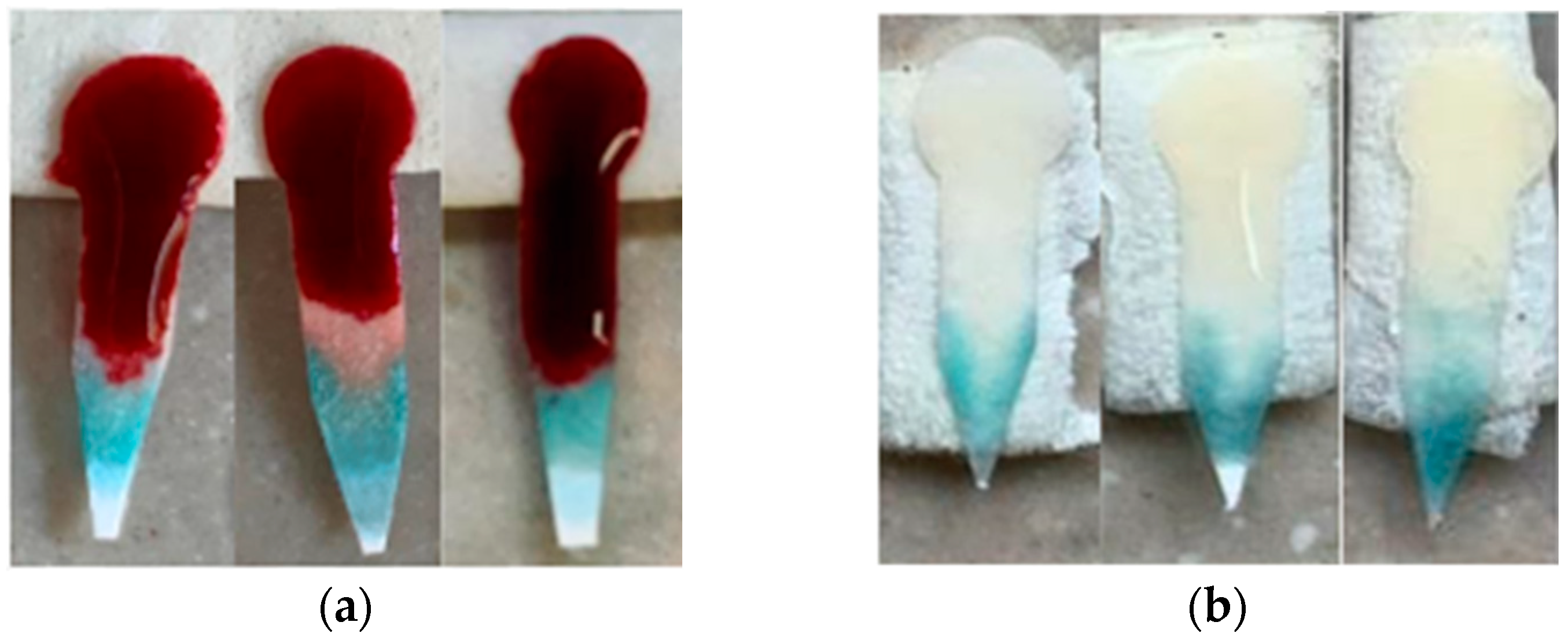 29]. NaCl generates an osmotic gradient that causes erythrocyte crenation, favoring their aggregation and arrest in the initial areas of the paper; meanwhile, sodium heparin acts as an anticoagulant by inhibiting the action of thrombin [