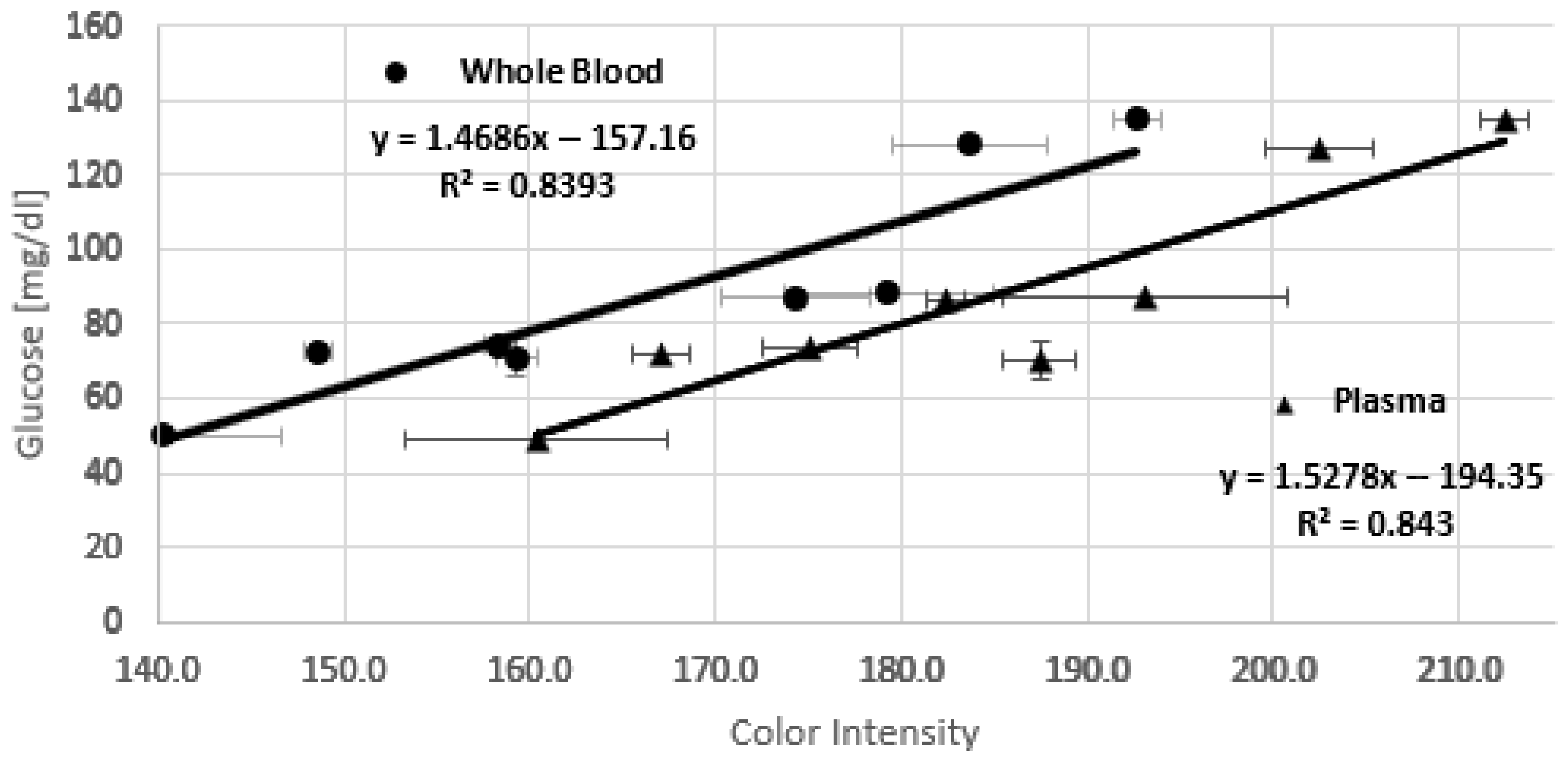 Calibration is performed through a linear regression between the color intensity recorded by the smartphone and the glucose concentration obtained with the commercial blood glucose test kit. The obtained calibration equation allows the app to adjust an unknown glucose concentration based on color intensity. Glucose determination in the lab is normally determined by using plasma samples. To evaluate if the measurement and the application are consistent when using either whole blood or plasma, a parallel evaluation was conducted. Data collected from several samples (whole blood (a), and plasma (b) from the same sample,