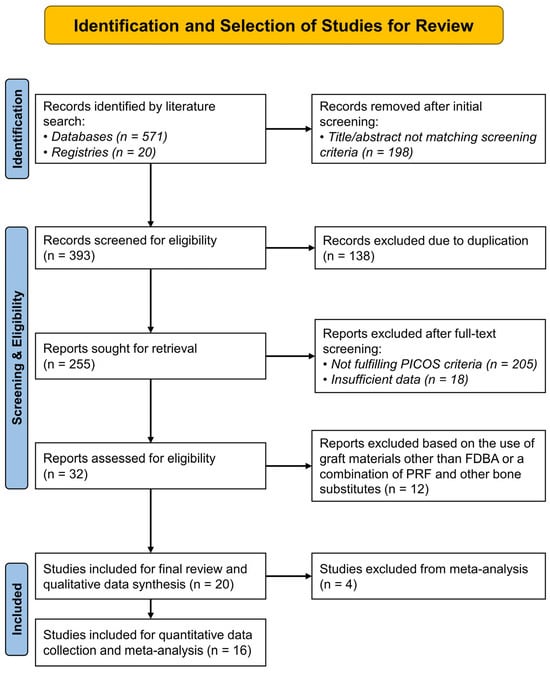 Exclusion criteria primarily encompassed studies that combined PRF or FDBA with other biomaterials (e.g., xenografts, synthetic grafts, barrier membranes) without separate analysis of PRF/FDBA alone. Moreover, reviews, case reports, non-comparative studies, publications lacking primary data (e.g., editorials), and studies reporting translational animal models and in vitro experiments were excluded to maintain clinical relevance.